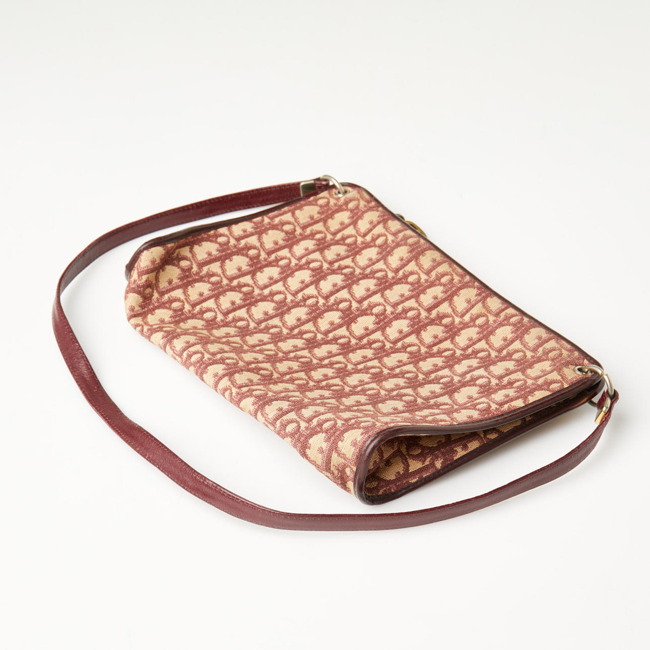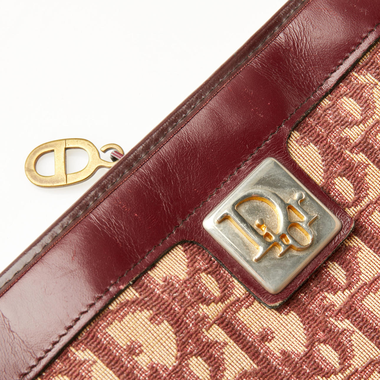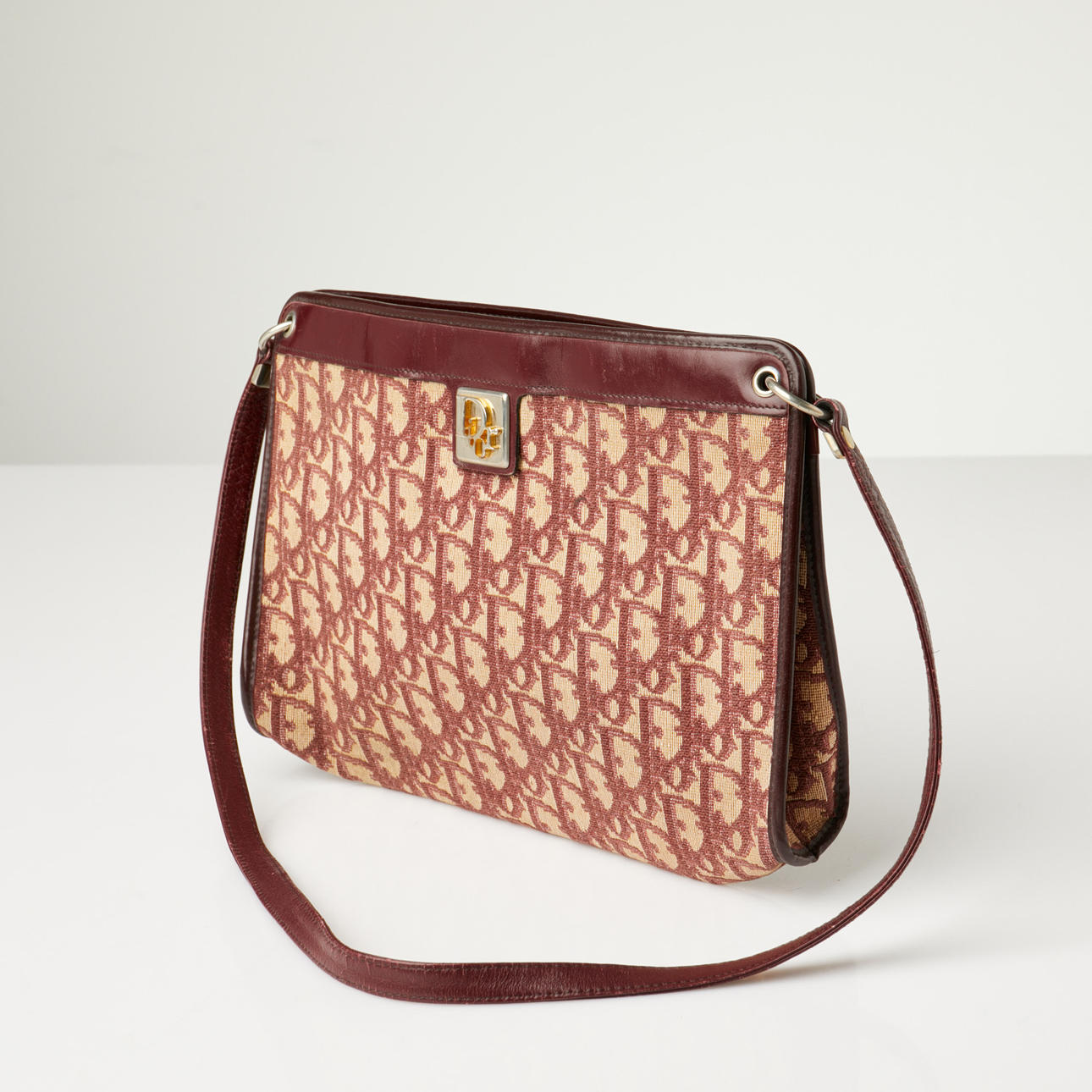 CHRISTIAN DIOR, Handtasche, monogrammierte Leinwand in beiger Farbe mit burgunderroten Details.