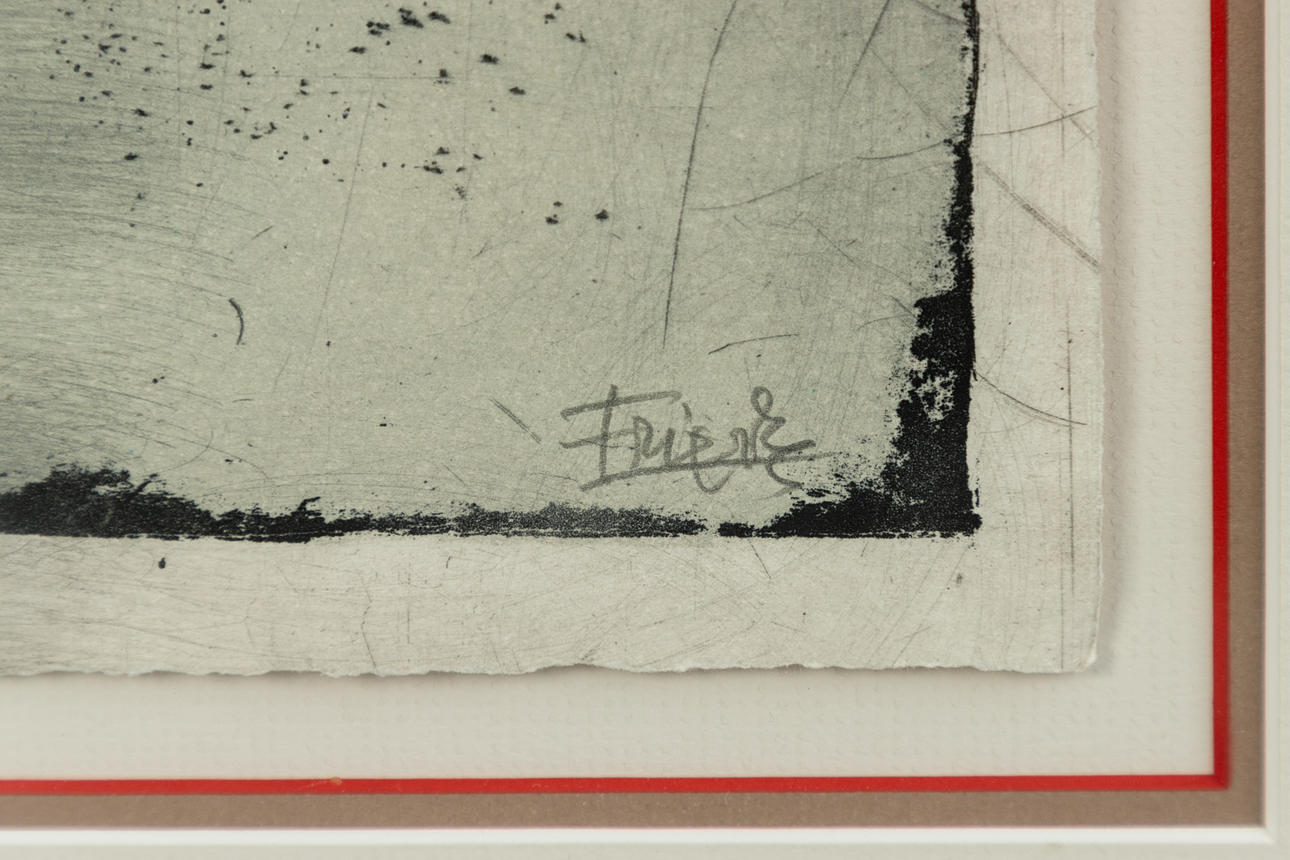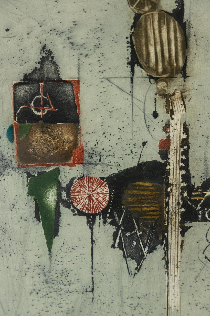 Johnny Friedlaender (1912-1992), Abstrakte Komposition, Farbige Aquatintaradierung, signiert und nummeriert, Exemplar 47/150, ca. 36 x 28 (Blattformat), hinter Glas gerahmt, mit Rahmen ca. 61 x 51 cm.