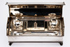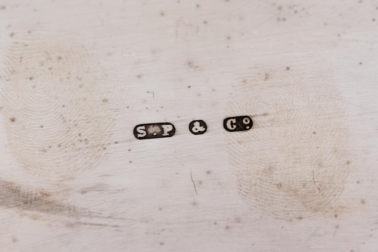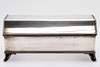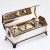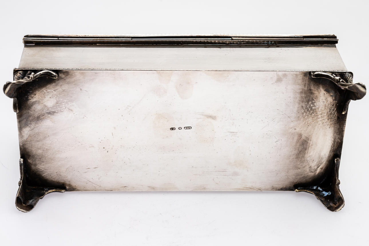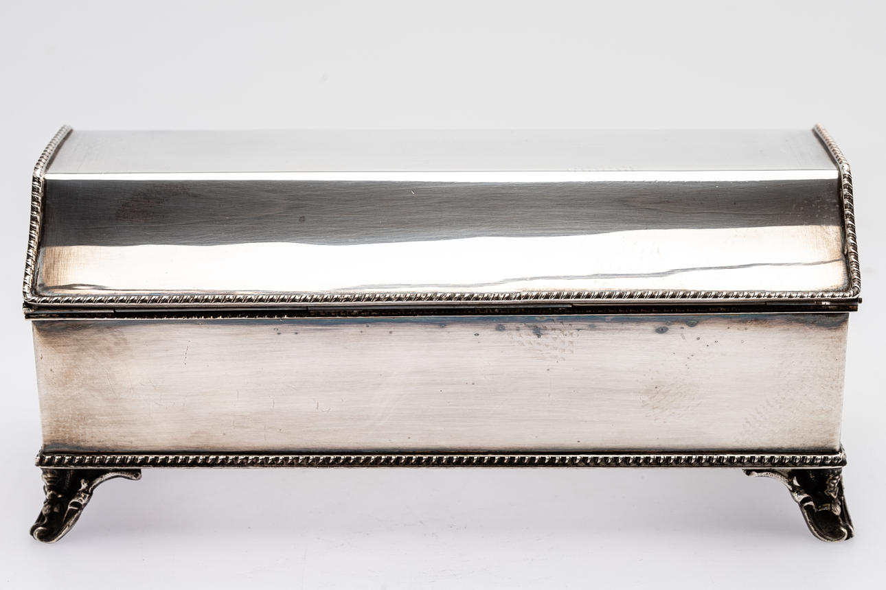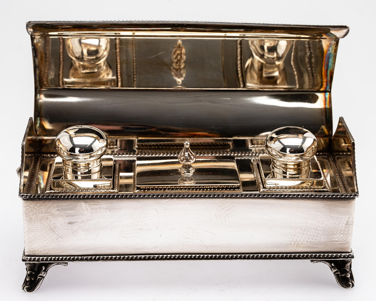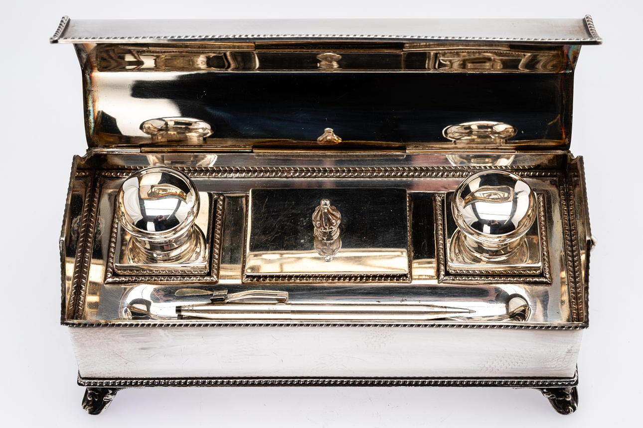 Metall. Rechteckiger Korpus auf vier volutierten Füßen. Der Deckel dreifach gekantet. Innen ein Briefmarkenetui flankiert von je einem Tintenfaß. Auf den Rändern Kordelbandeinfassungen. Auf der Bodenunterseite gestempelt S. P. & Co. HxBxT:10,5 x 23,5 x 10,5 cm. Zuzüglich eines Kugelschreibers, 925er Silber, A.T. Cross Pen Company, Irland.