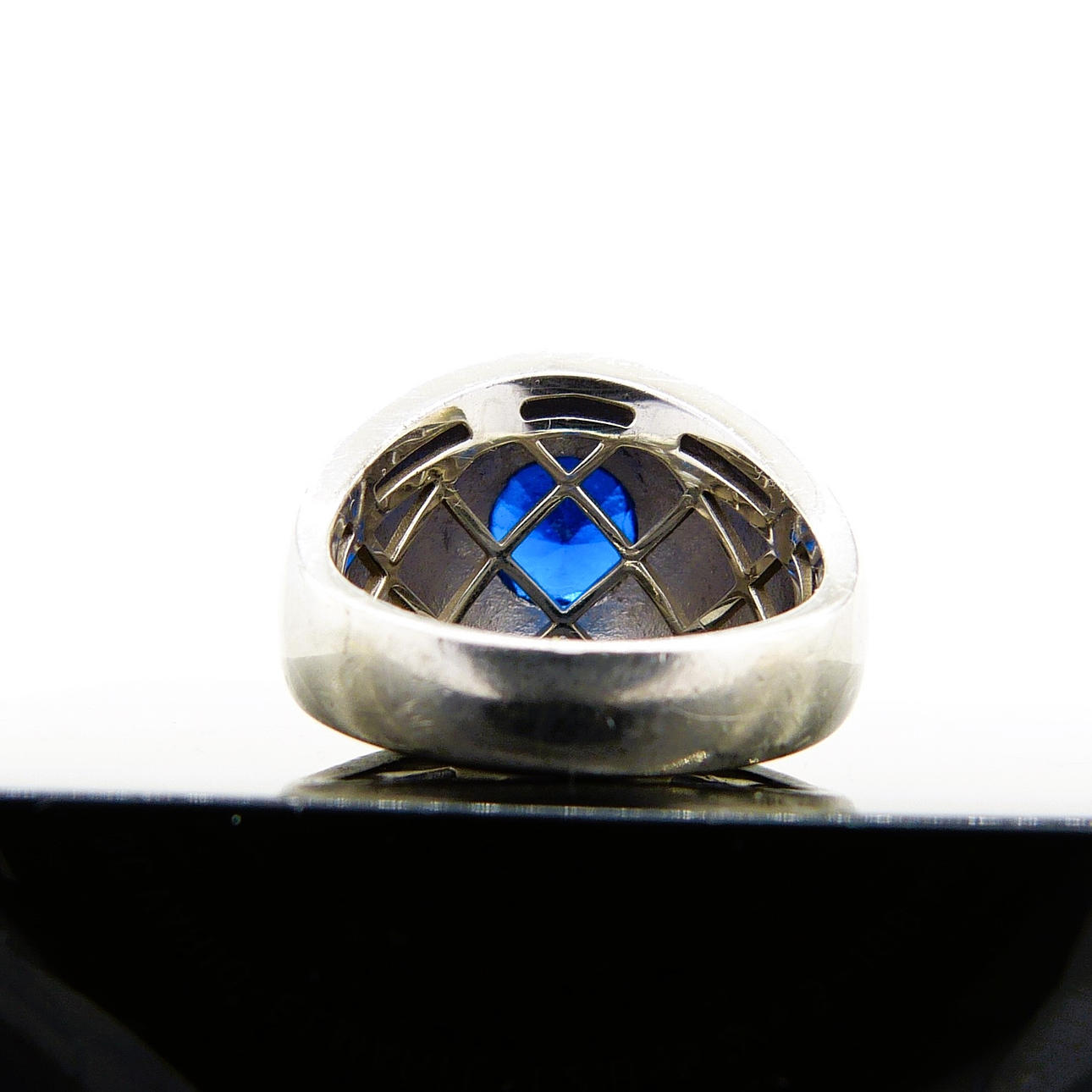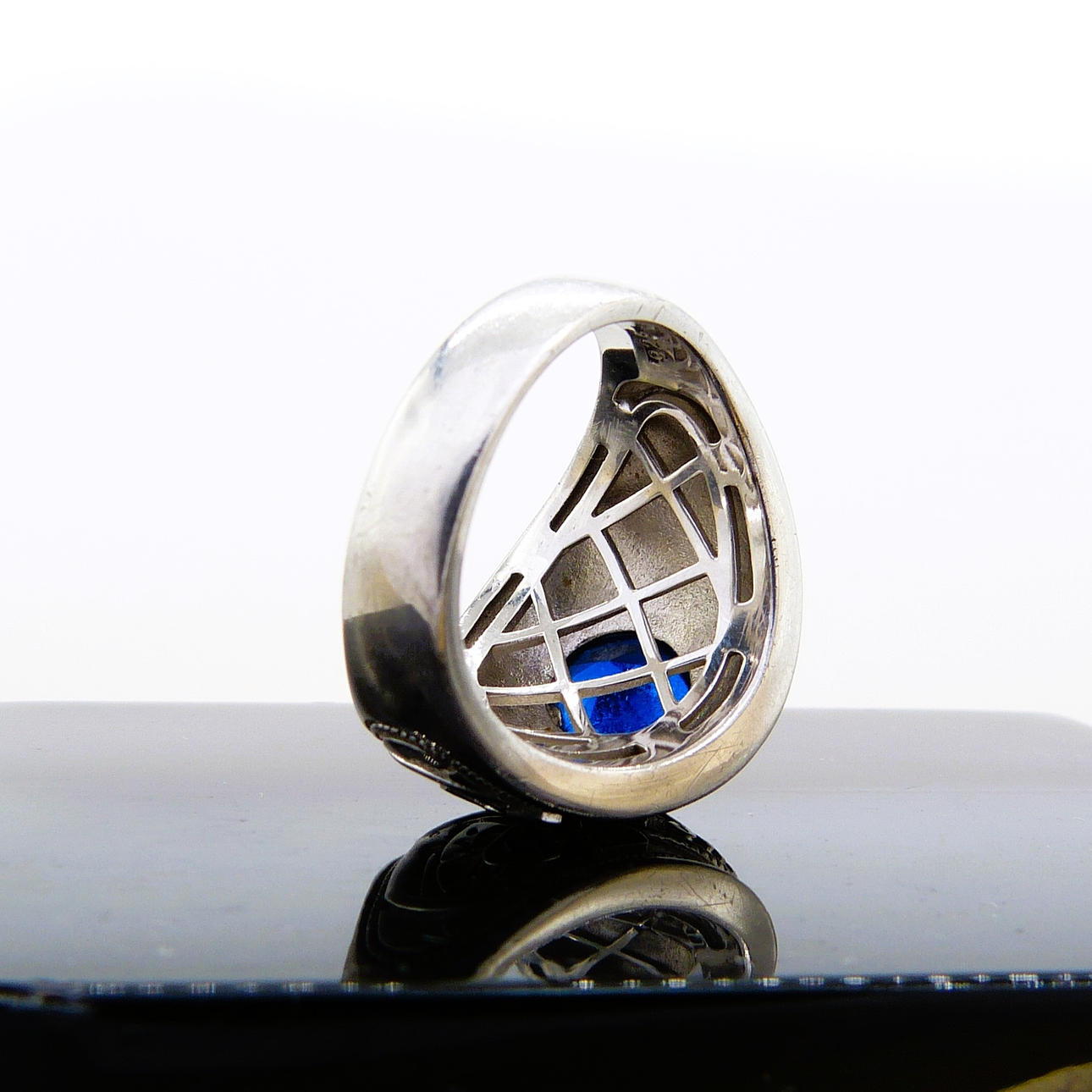 In der Mitte dieses Rings befindet sich ein tiefblauer Stein im Rundschliff mit einem Durchmesser von ca. 8½ mm.