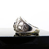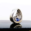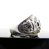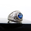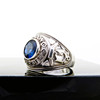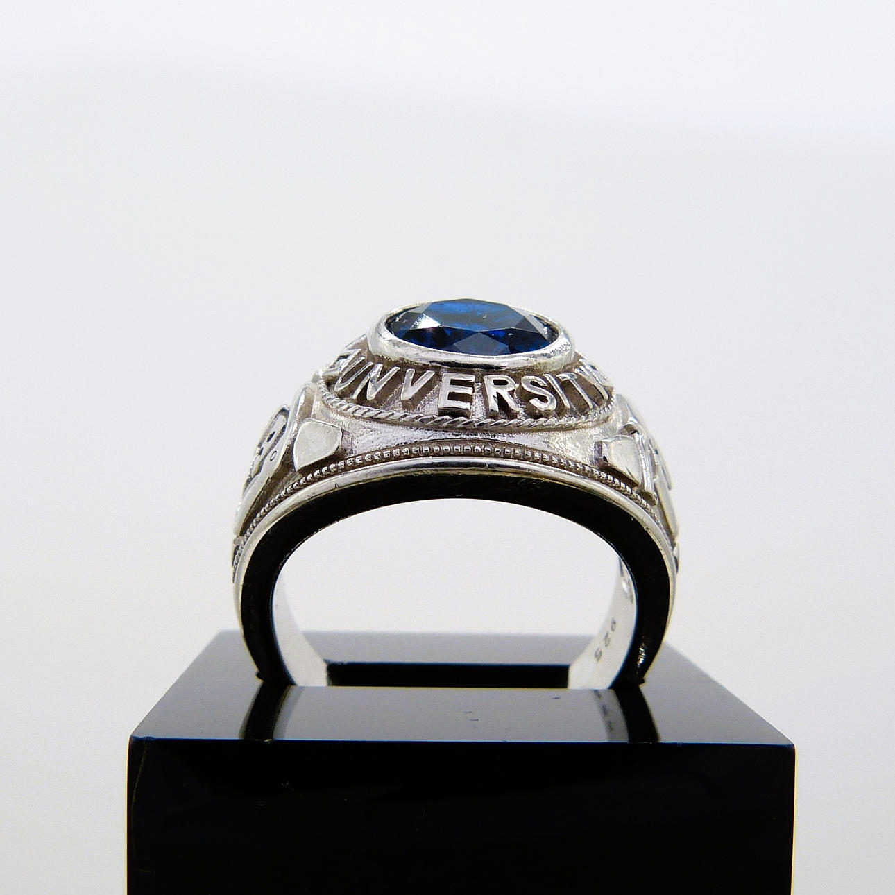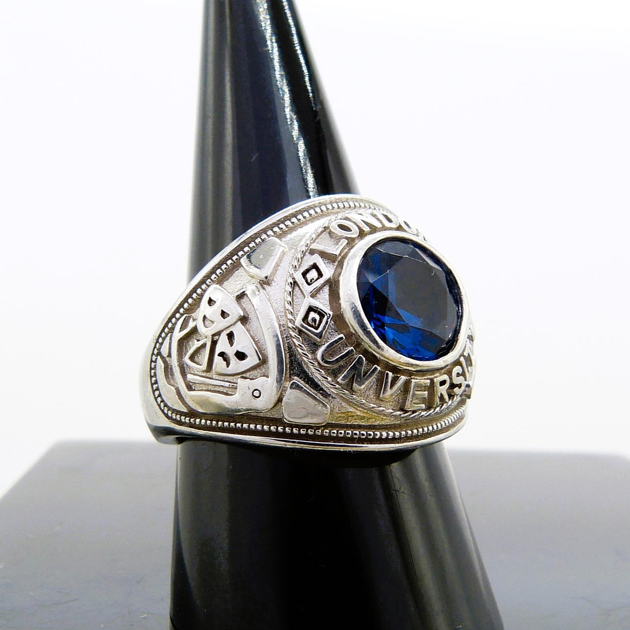 Ein großer und schwerer College-Ring aus Silber, der mit einem blauen Stein besetzt und mit der Prägung „LONDON UNIVERSITY“ versehen ist.