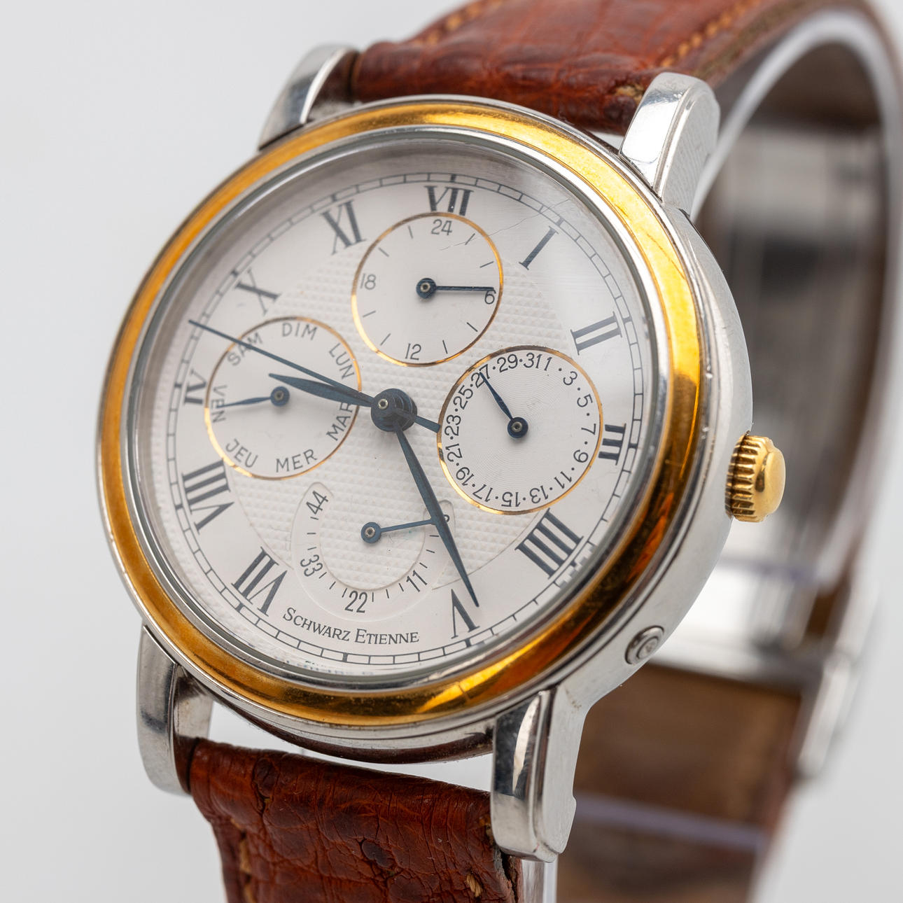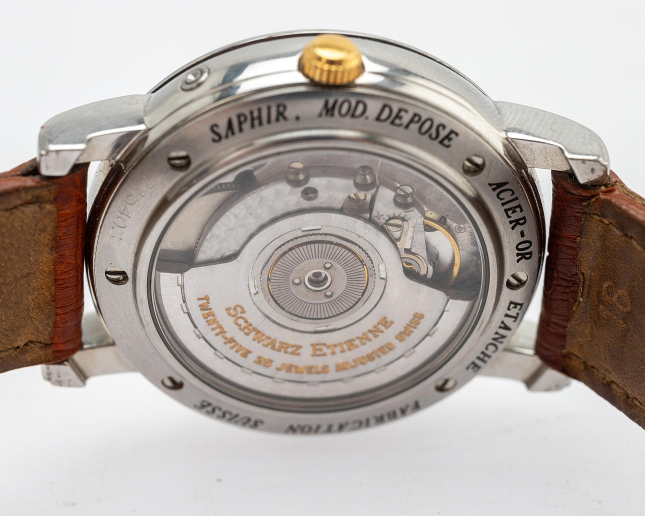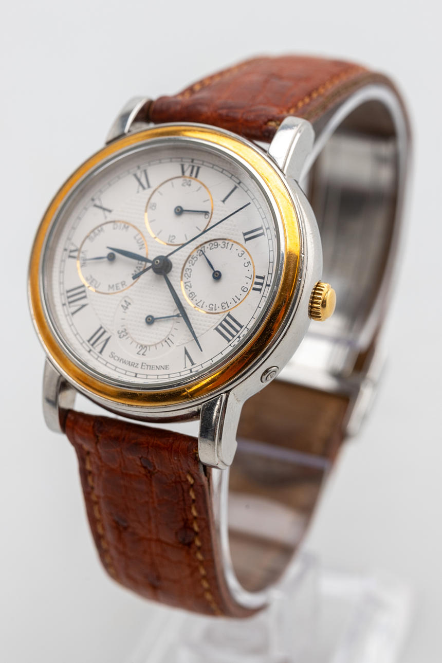Ambanduhr von Schwarz Etienne Gehäuse aus Edelstahl, weißes Zifferblatt mit Gangreserve, Saphirglas, Lederband mit Faltschließe nicht von Schwarz Etienne, Automatikwerk. Maße ca. Durchmesser Ø 36 mm. Zum Zeitpunkt der Begutachtung lief die Uhr (Datum funktioniert nicht), Stockholms Auktionsverk garantiert nicht für die Funktionalität.