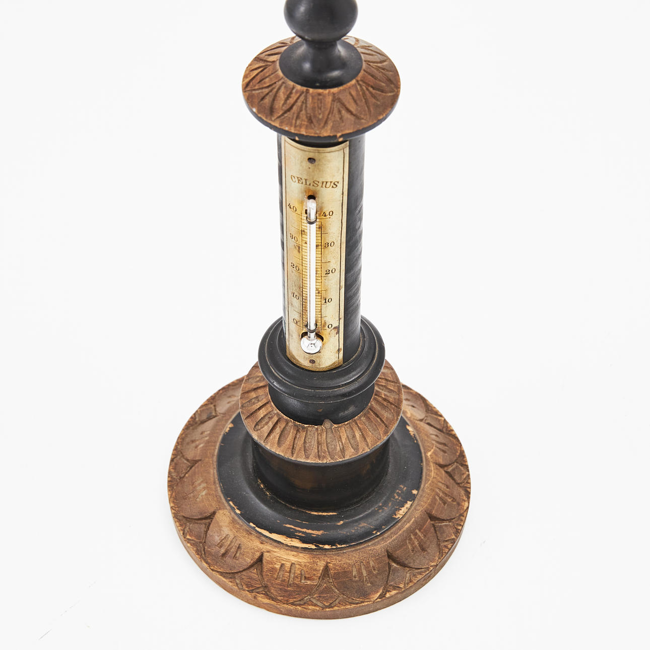 Thermometer aus Messing auf geschwärztem Holz, montierter Globus, Höhe ca. 31, Kugeldurchmesser 3,5 cm.