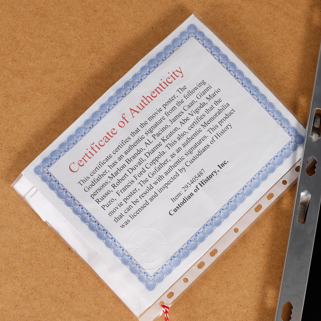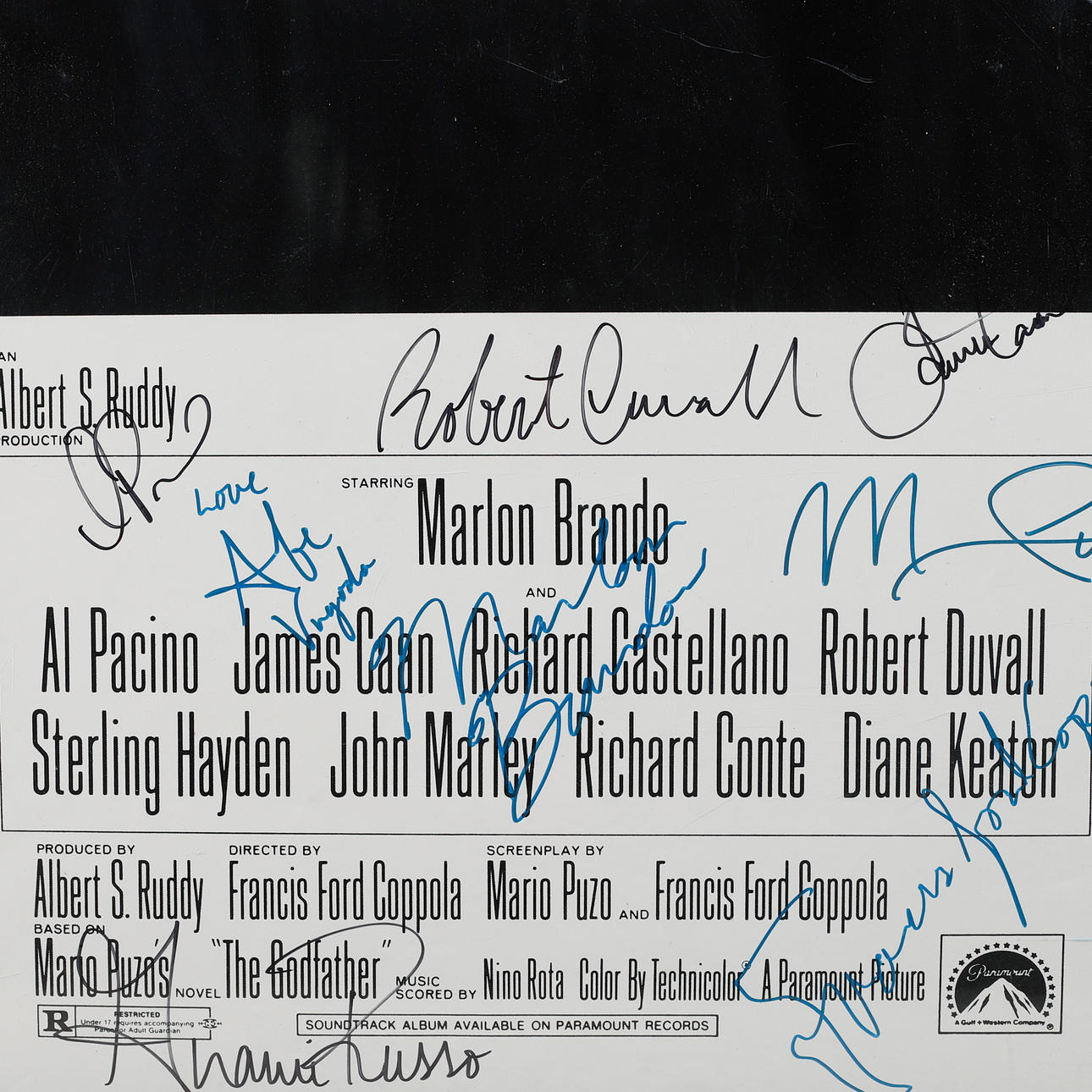 Signiert von: Marlon Brando, AL Pacino, James Caan, Gianni Russo, Robert Duvall, Dianne Keaton, Abe Vigoda, Mario Puzo und Francis Ford Coppola. Zertifikat und vorherige Auktionsquittung sind enthalten. Ca. 99 x 68 cm, Rahmenmaße ca. 100 x 71 cm.