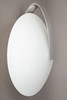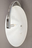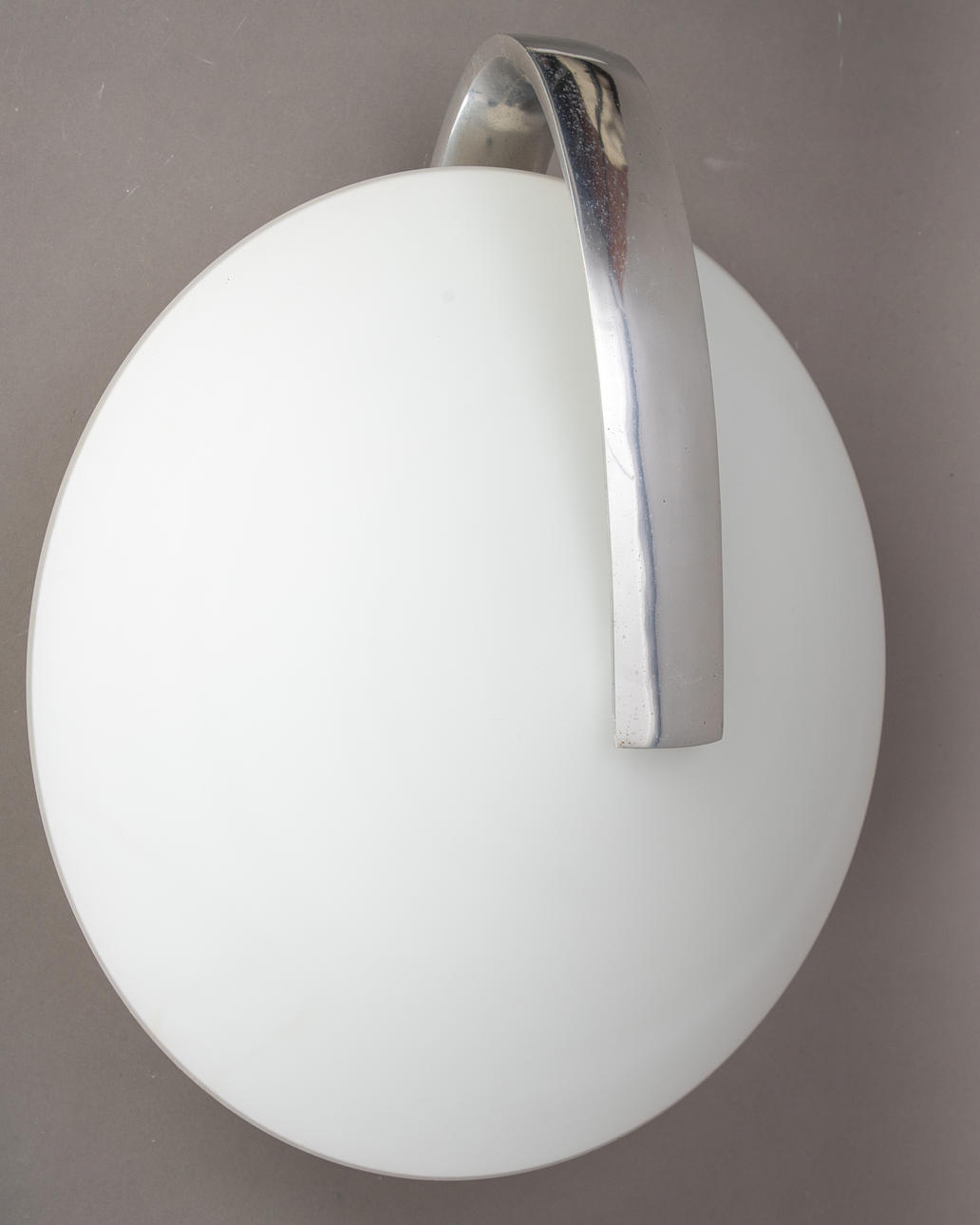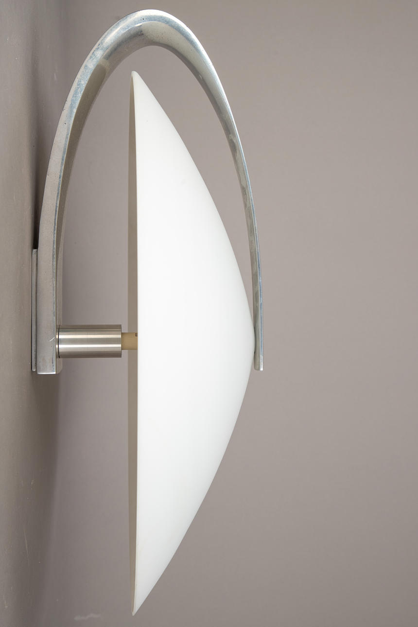 Halterung aus poliertem Metallguss. Schirm mundgeblasenes satiniertes Glas. Eine Brennstelle.