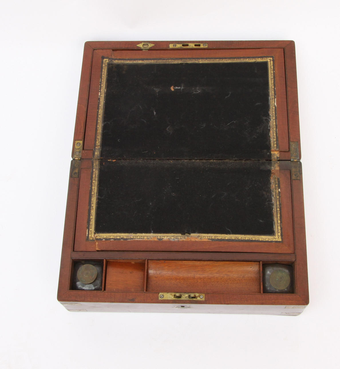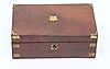 Mahagoni mit Messingbeschlägen, aufklappbar,Schreibplatte mit Lederbezug,15x42x15 cm.