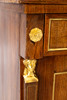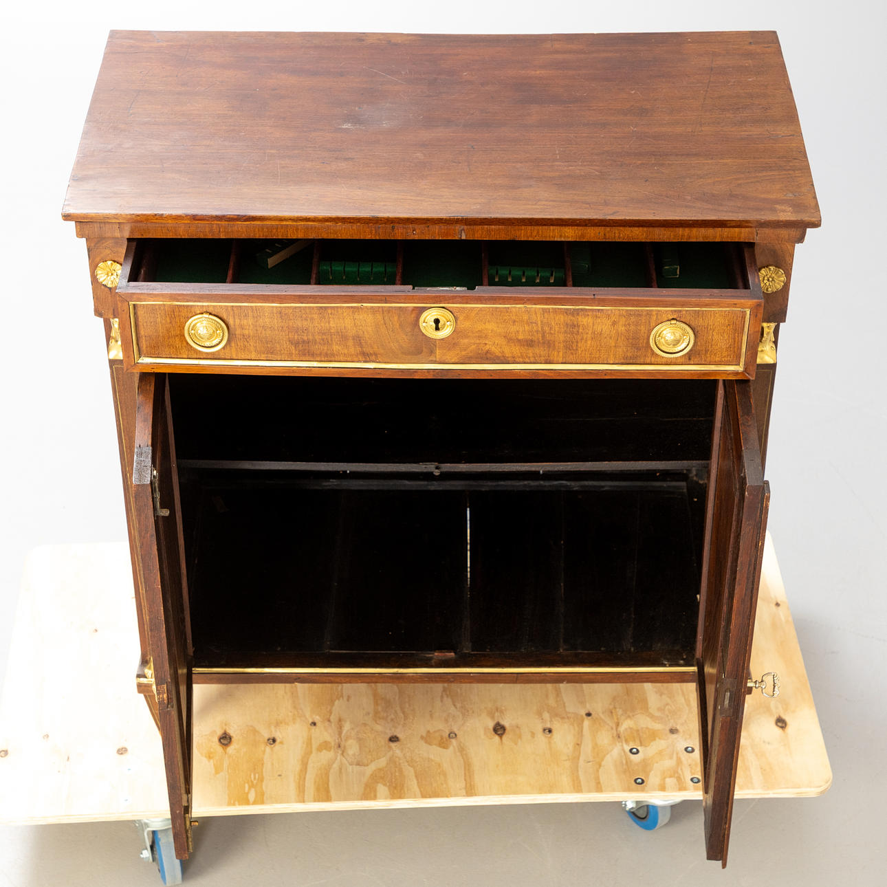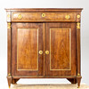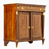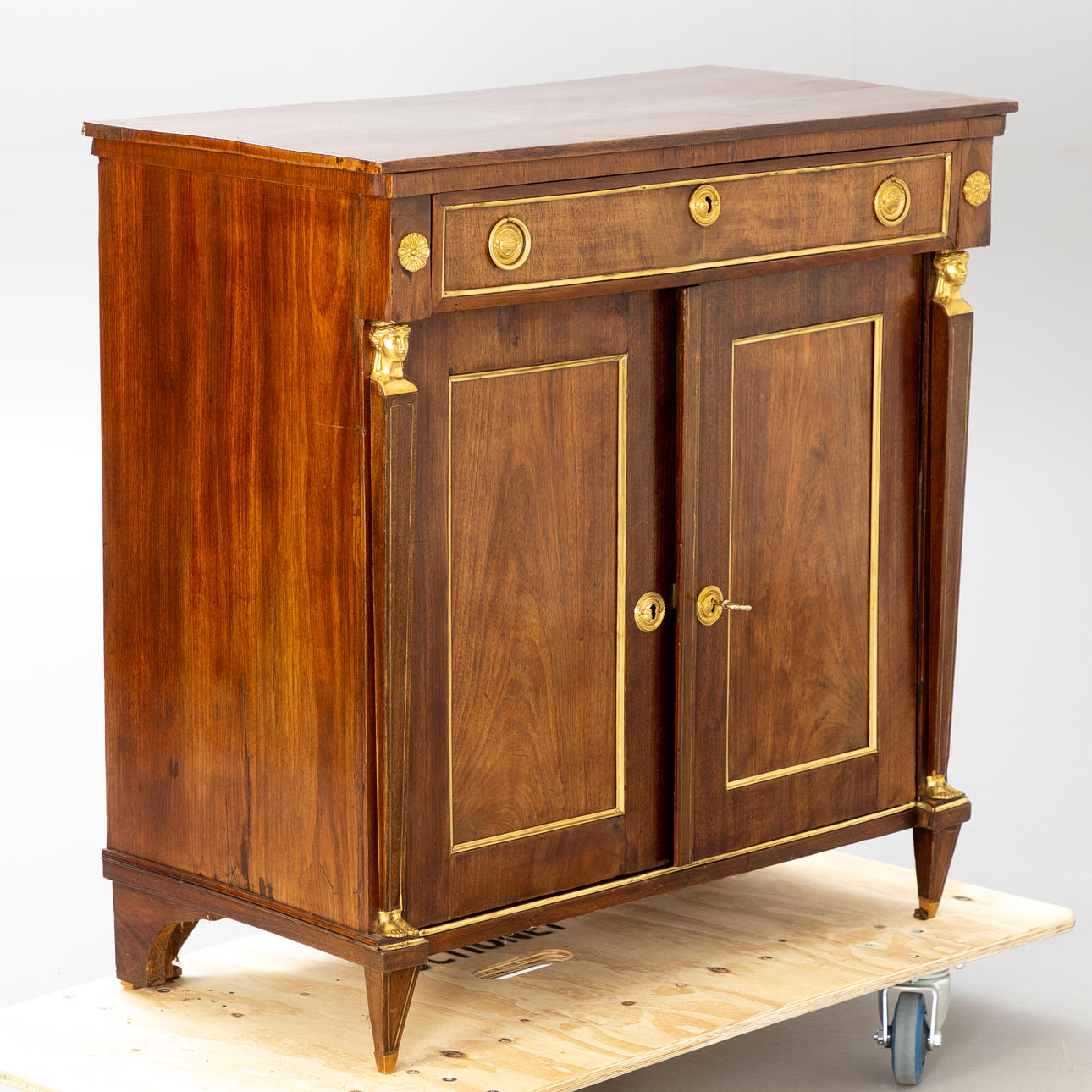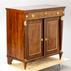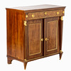 Mahagoni auf Nadelholz furniert/ Messingapplikationen, tlw. vergoldet. Rechteckiger Korpus auf konischen Vierkantfüßen. Die Front durch zwei Türen und einer abschließenden Schublade gegliedert. Flankiert von eingestellten Karyatiden. Intarsierte Messingfäden und die Füllungen in profilierten Messingrahmungen. Die Beschläge in Form von Rosetten Ringösen vor Vasenmotiven und die humanoiden Elemente später. HxBxT: 92,5 x 89 x 47 cm.