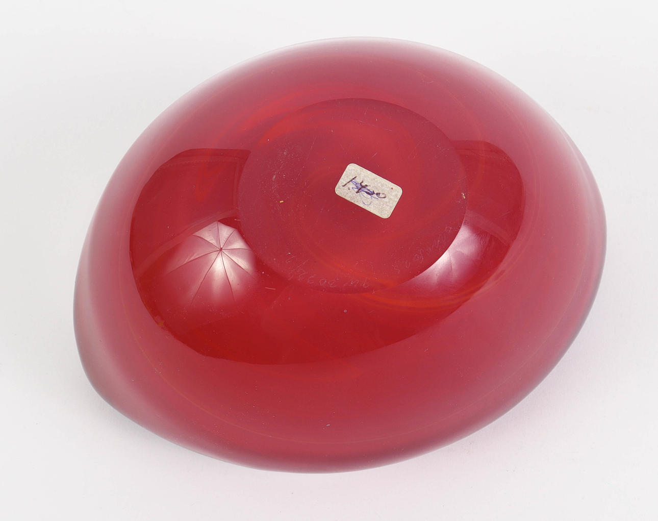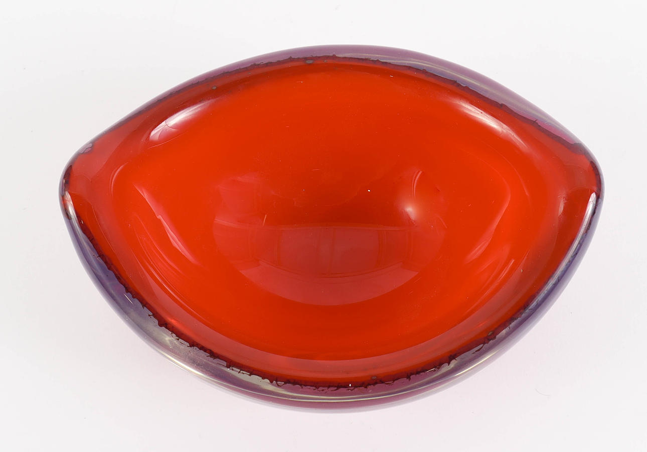 Klare Glasmasse mit eingelegtem rotem Fonds. Signiert „Torrefors PW 3092/2".