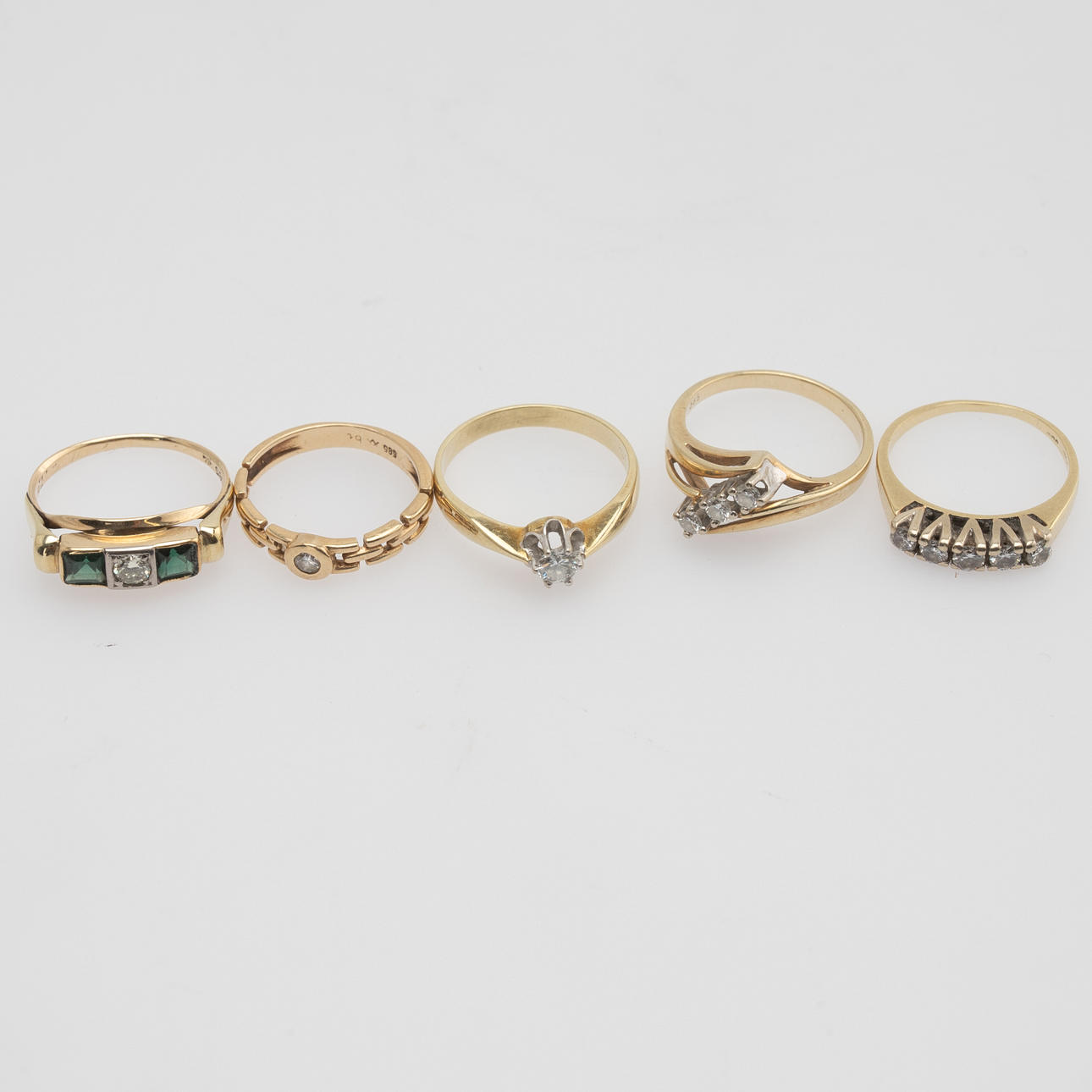 Konvolut bestehend aus 5 Ringe, gefertigt aus 585er Gold, besetzt mit Diamanten, 1 Ring mit zwei grünen synthetischen Steinen. Ringgröße ca. 52 - 57. Gesamtgewicht ca. 15,5 Gramm.