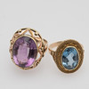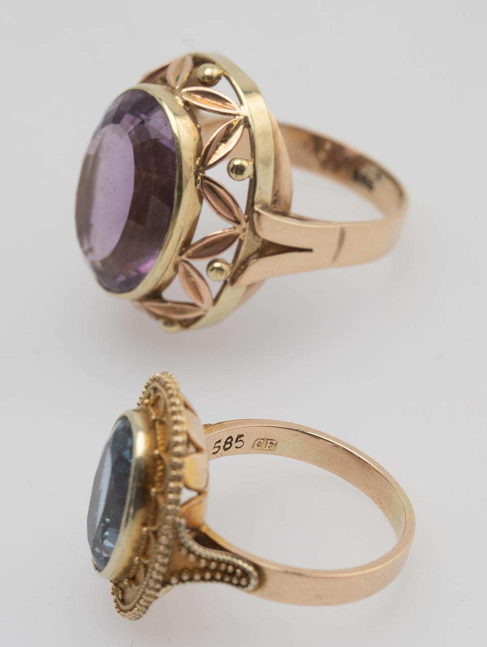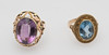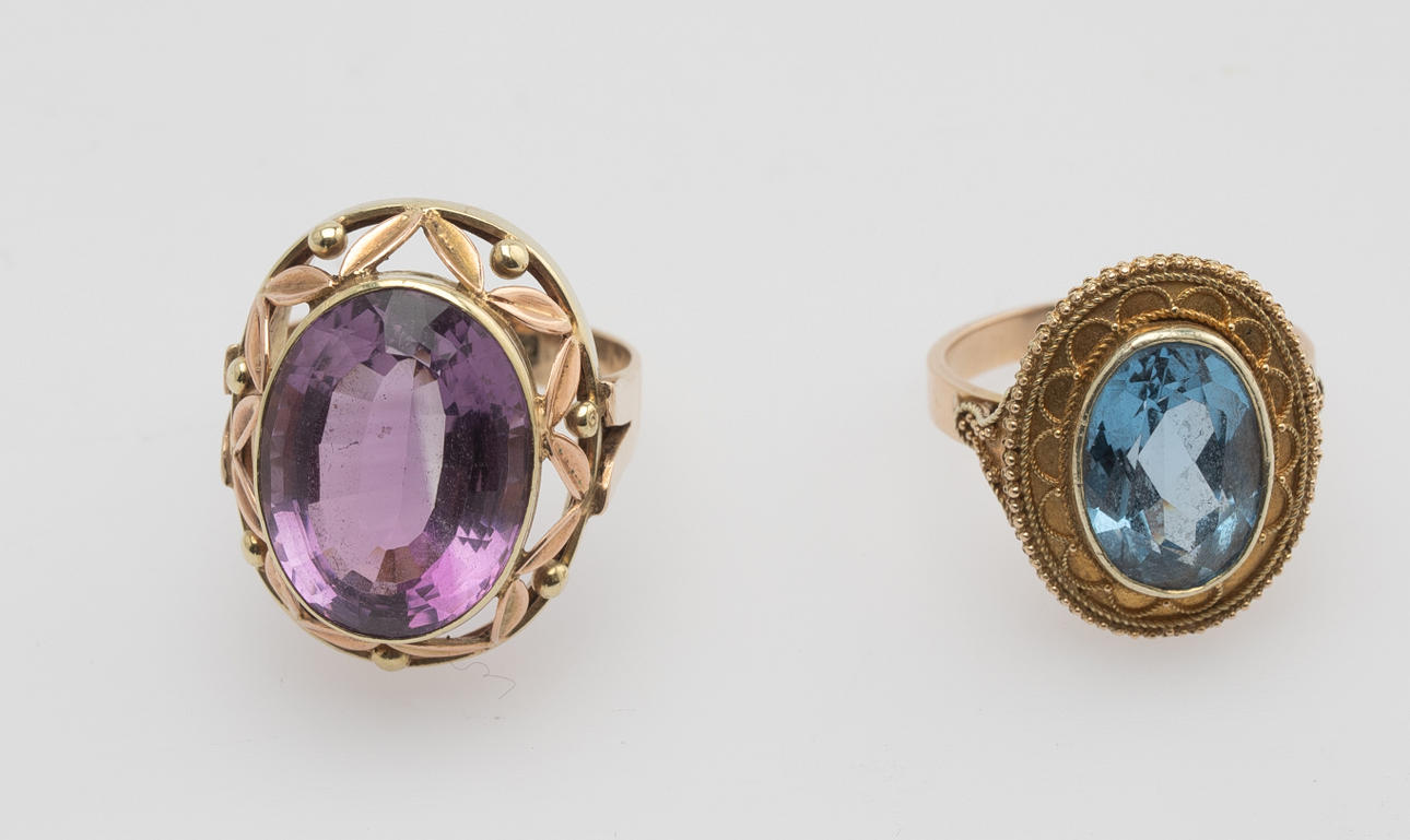 1 Ring gefertigt aus 585er Gold, besetzt mit einem Amethyst. 1 Ring gefertigt aus 585er Gold, besetzt mit einem synthetischen Spinell. Ringgröße ca. 55 - 57. Gesamtgewicht ca. 14,7 Gramm.