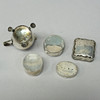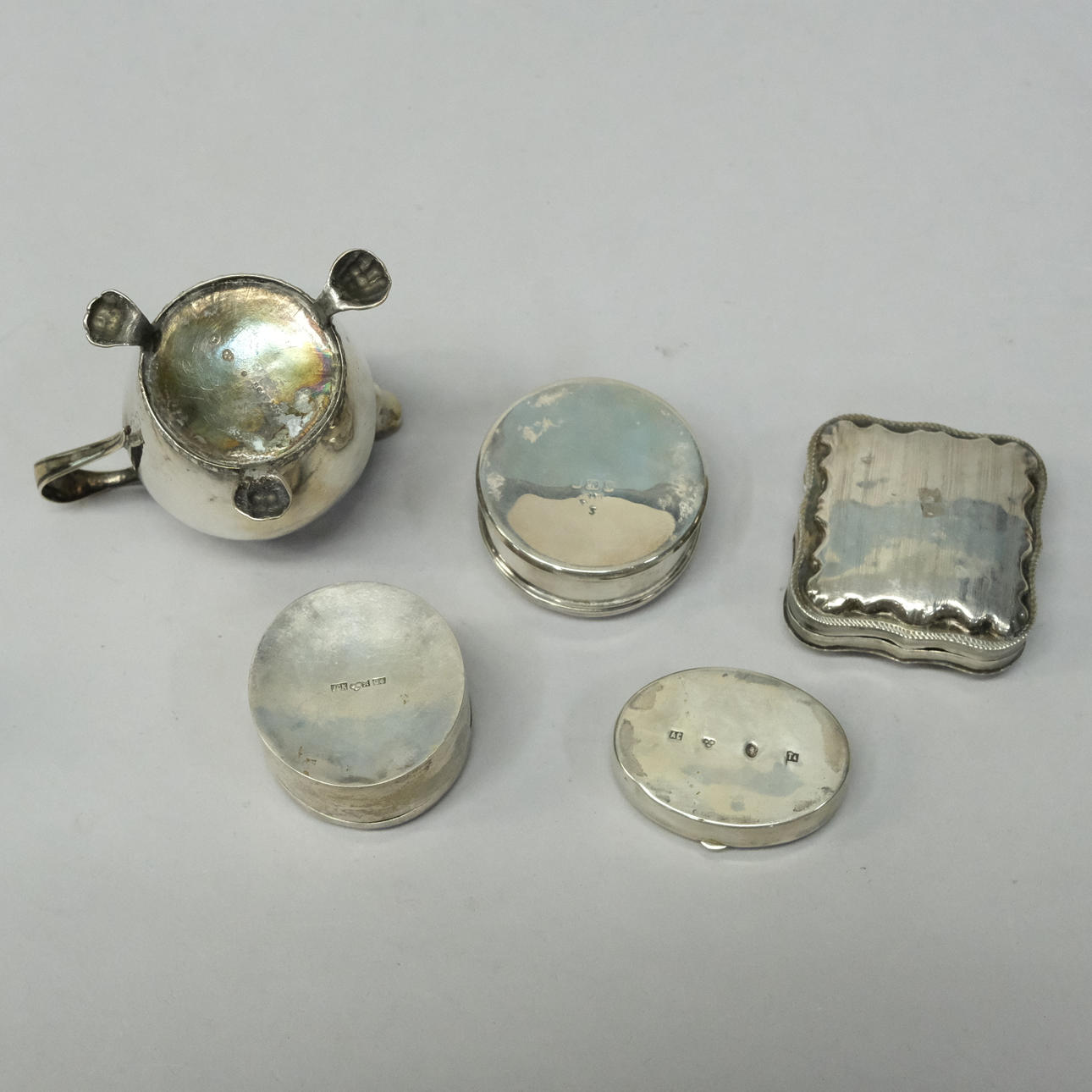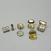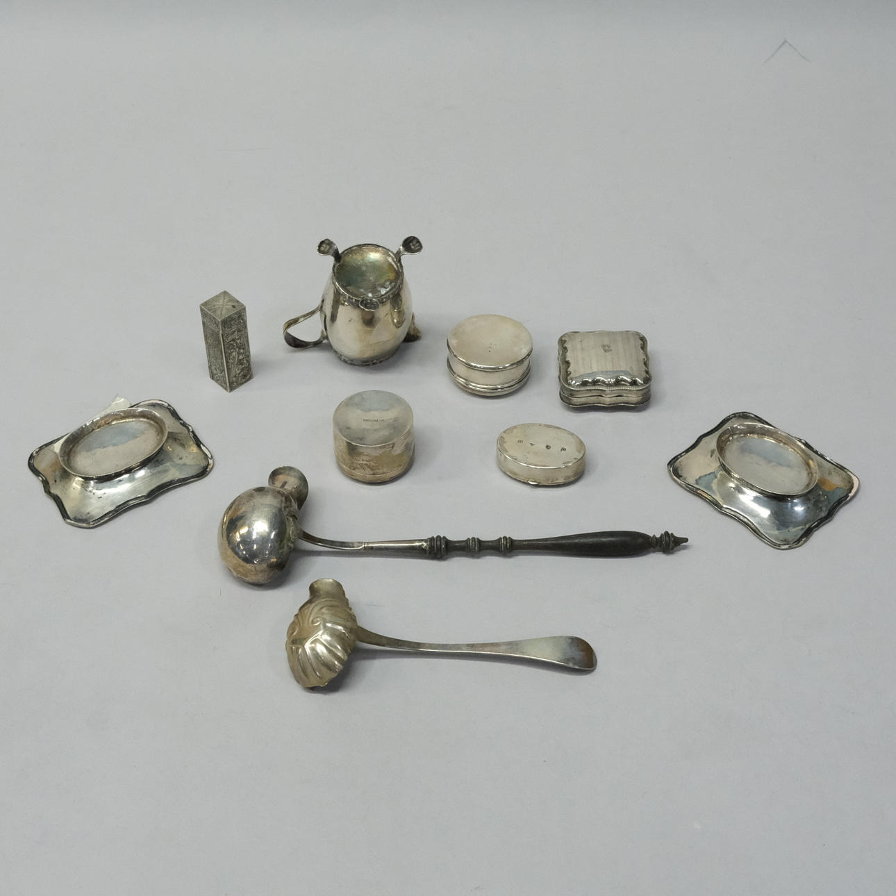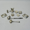 3 Gläser, 1 Paar Salzpfannen, 1 Sahnekännchen, 2 Schöpfkellen, 19. Jahrhundert und 1 Dose und 1 Lippenstifthalter mit Spiegel, erste Hälfte des 20. Jahrhunderts, Gesamtgewicht ohne Saucenlöffel mit Holzgriff 257 Gramm.