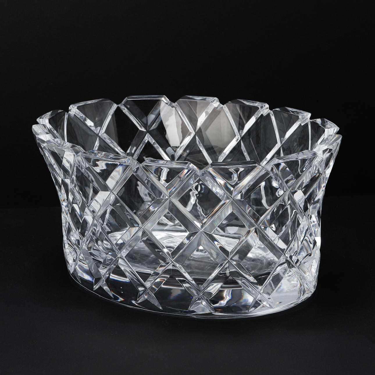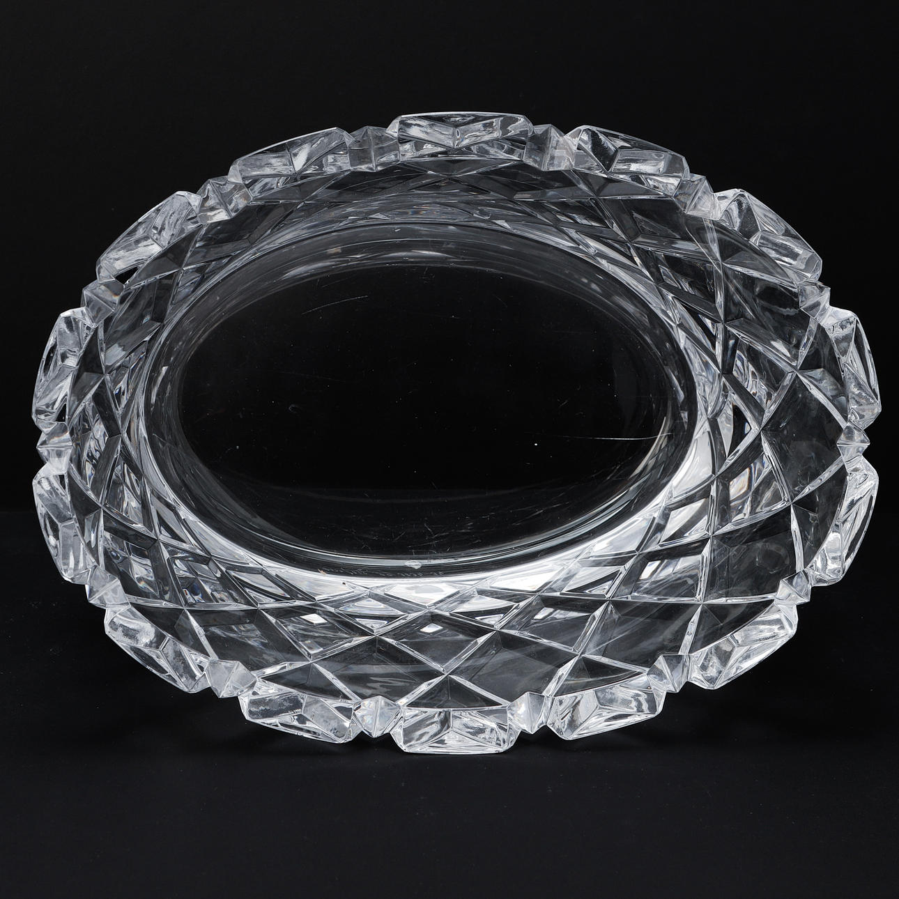 Ovale Form Geschliffenes Dekor. Länge 30 cm, Höhe 15 cm.