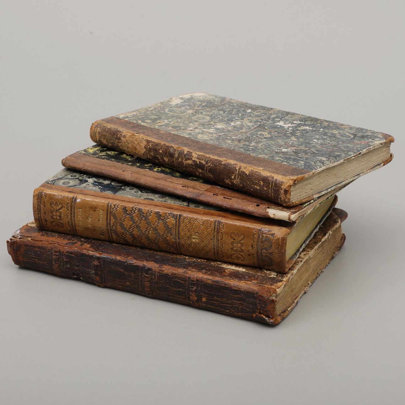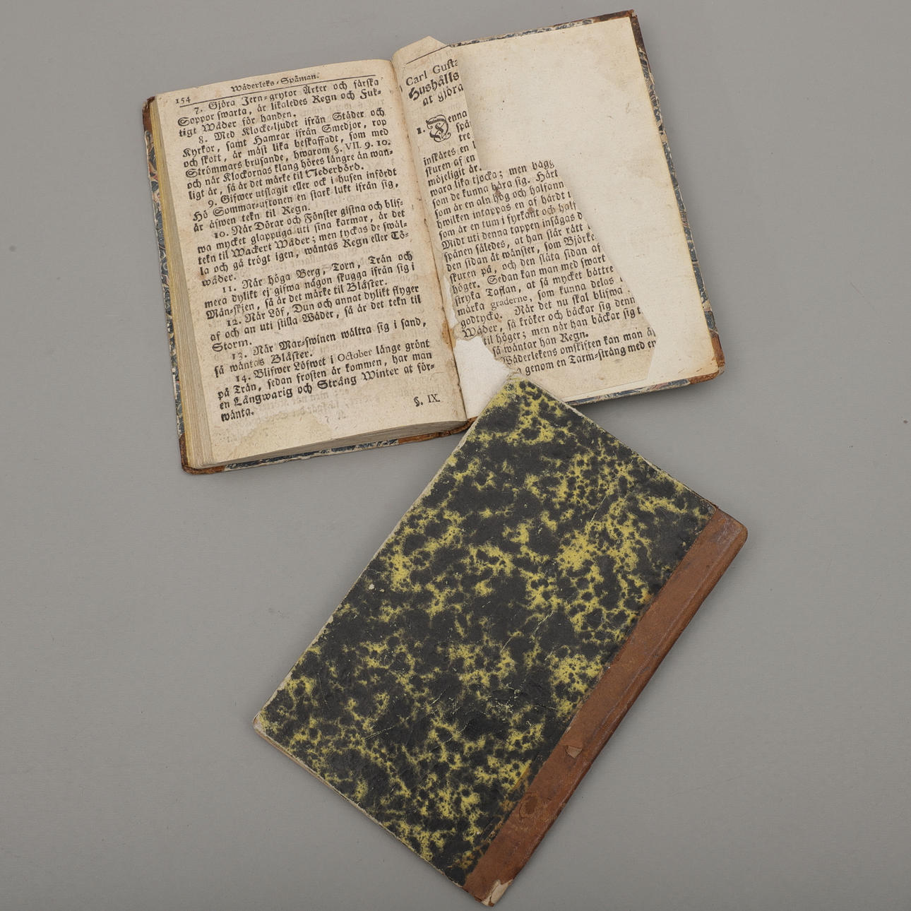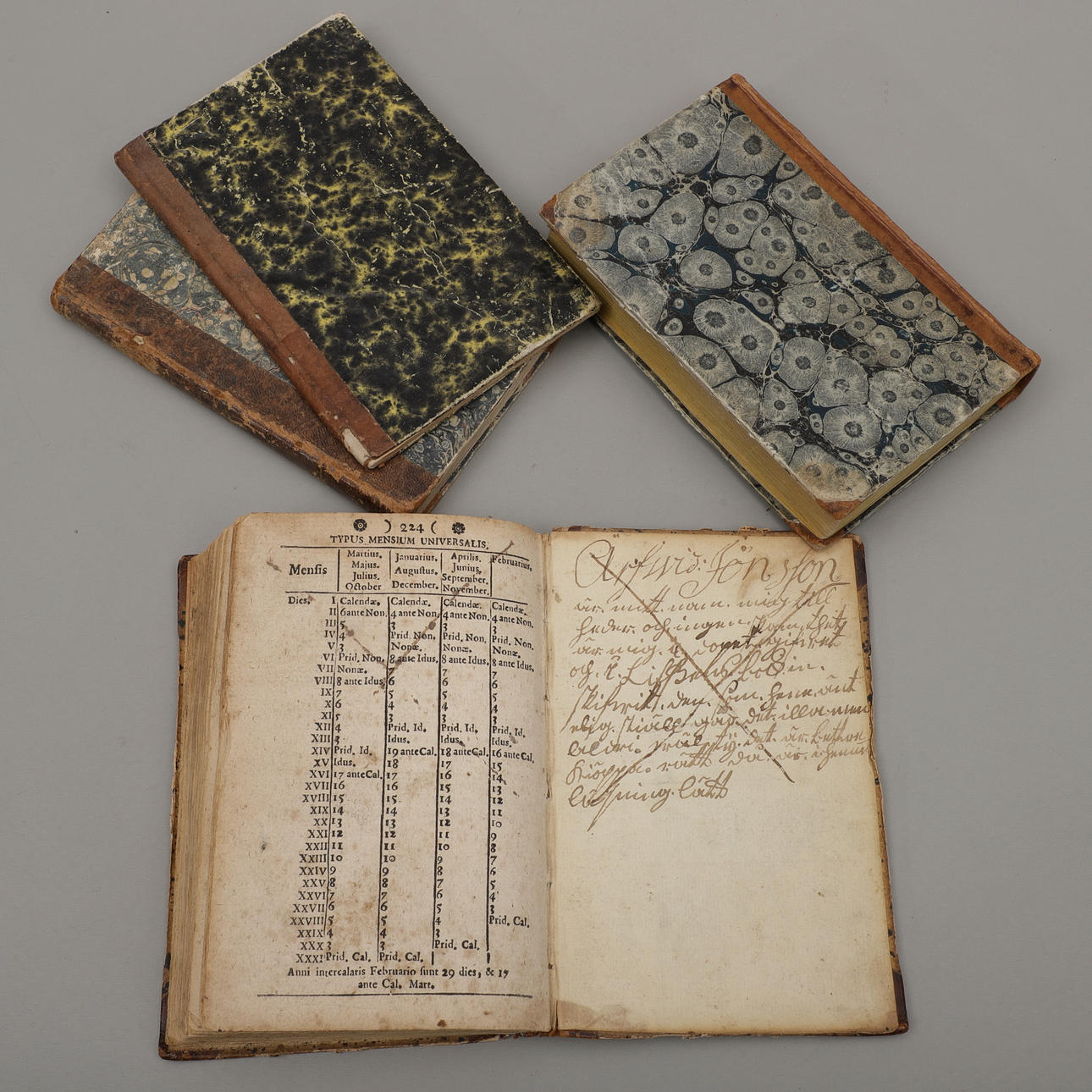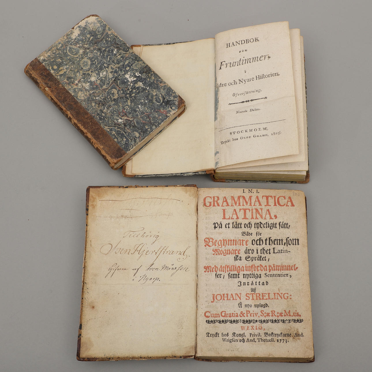 Wetter-Almanach, Burman, 1768. Handbuch von Fruntimmer, neunter Teil, 1813. Lateinische Grammatik, Johan Streling, 1773. ABC-Buch, 1870.