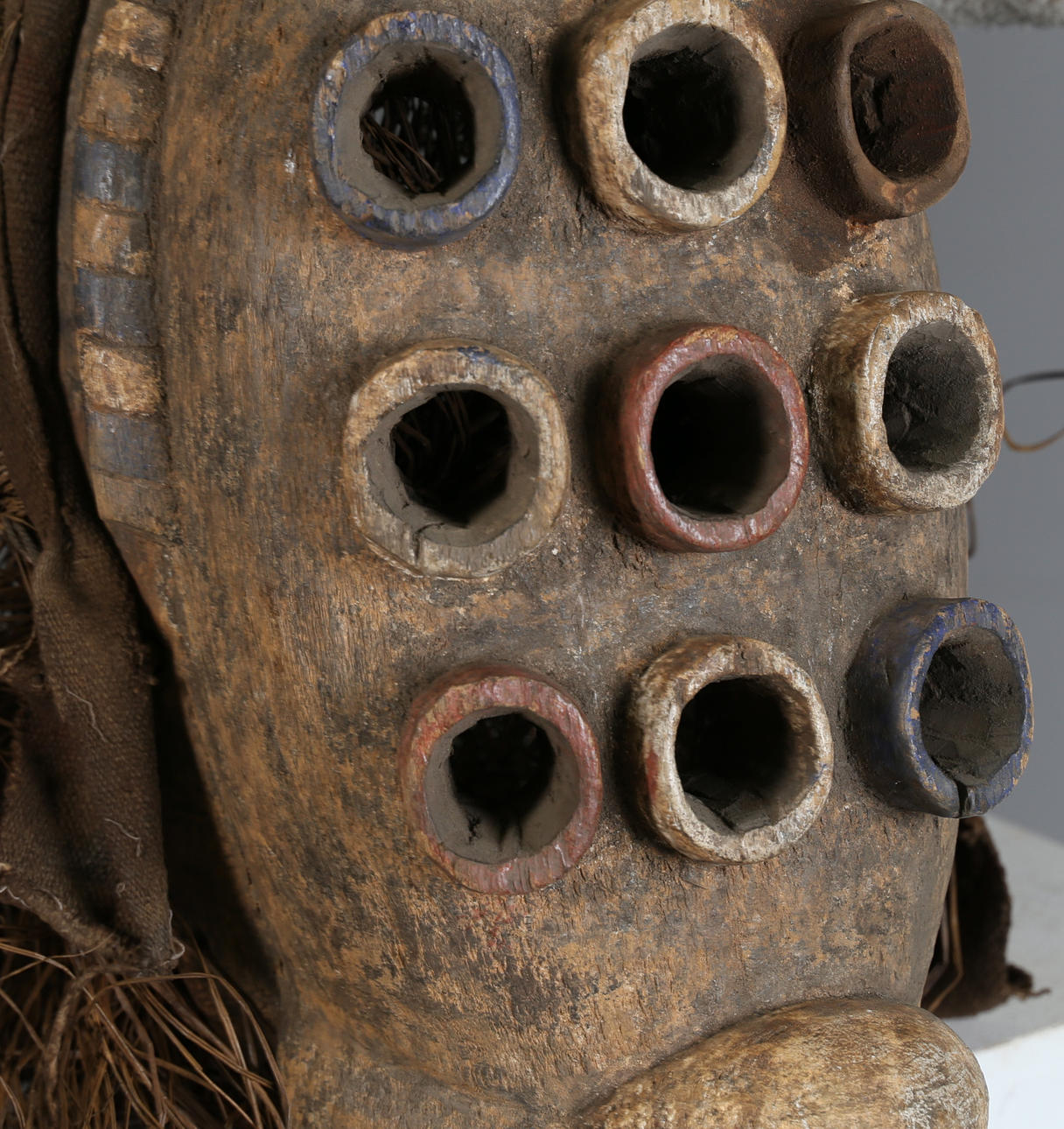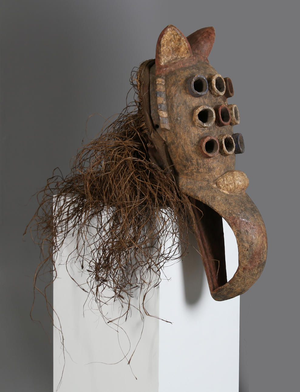 zweites Drittel des 20. Jahrhunderts, oben zwei Hörner über neun pigmentierten Augen, darüber ein Schnabel mit Naturfaserrücken, 70 cm hoch und 21 cm breit