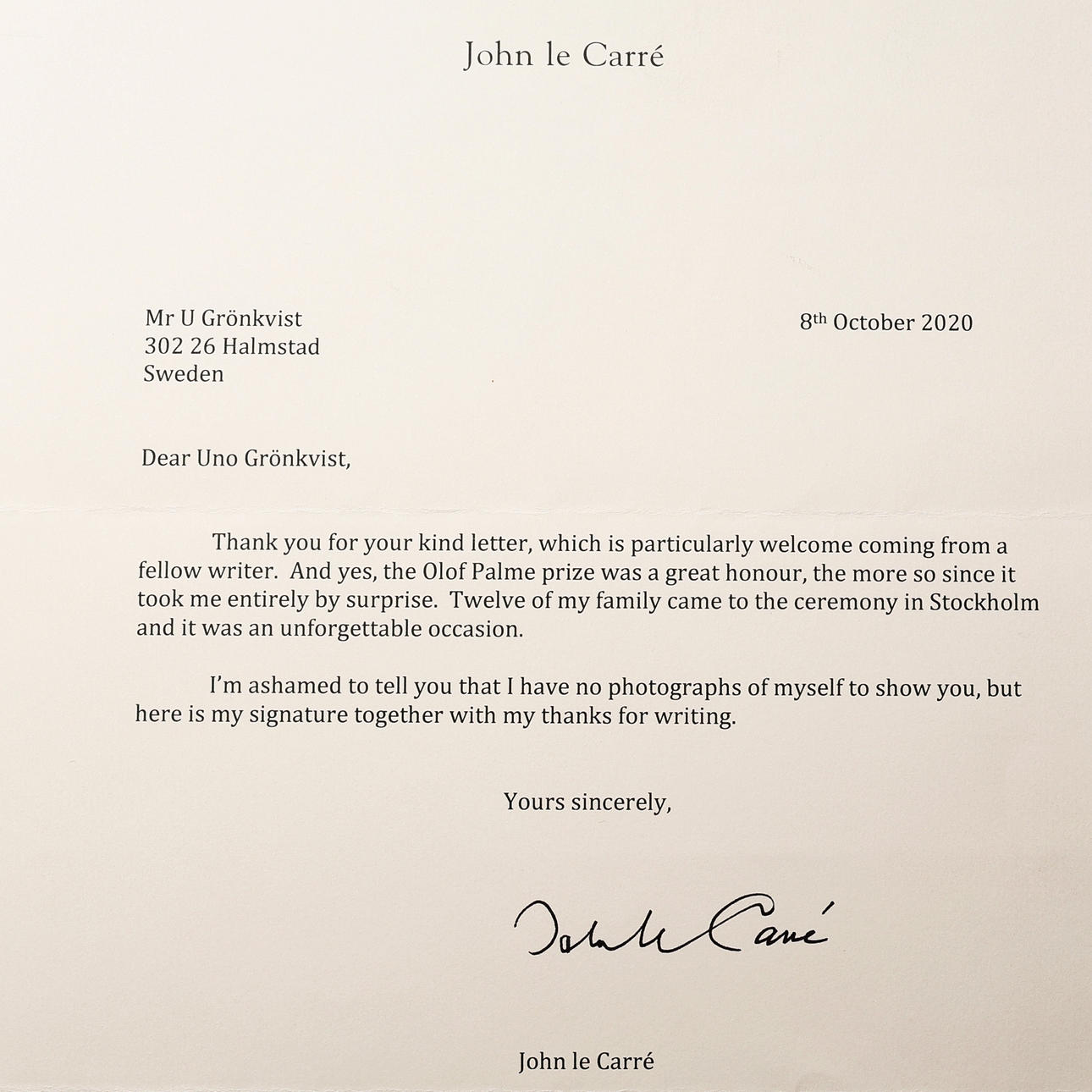 Autogramm. John le Carré, Pseudonym für David John Moore Cornwell, Cornwall, war ein britischer Autor von Spionageromanen über den britischen Geheimdienst während des Kalten Krieges. Er gilt als Meister der Spionageromane und war selbst als Spion beim Geheimdienst Secret Intelligence Service tätig. Selbstunterschriebener Brief an Uno Grönkvist. Der gesamte Erlös geht an Ärzte ohne Grenzen. Provenienz: Uno Grönkvists Autogrammsammlung.