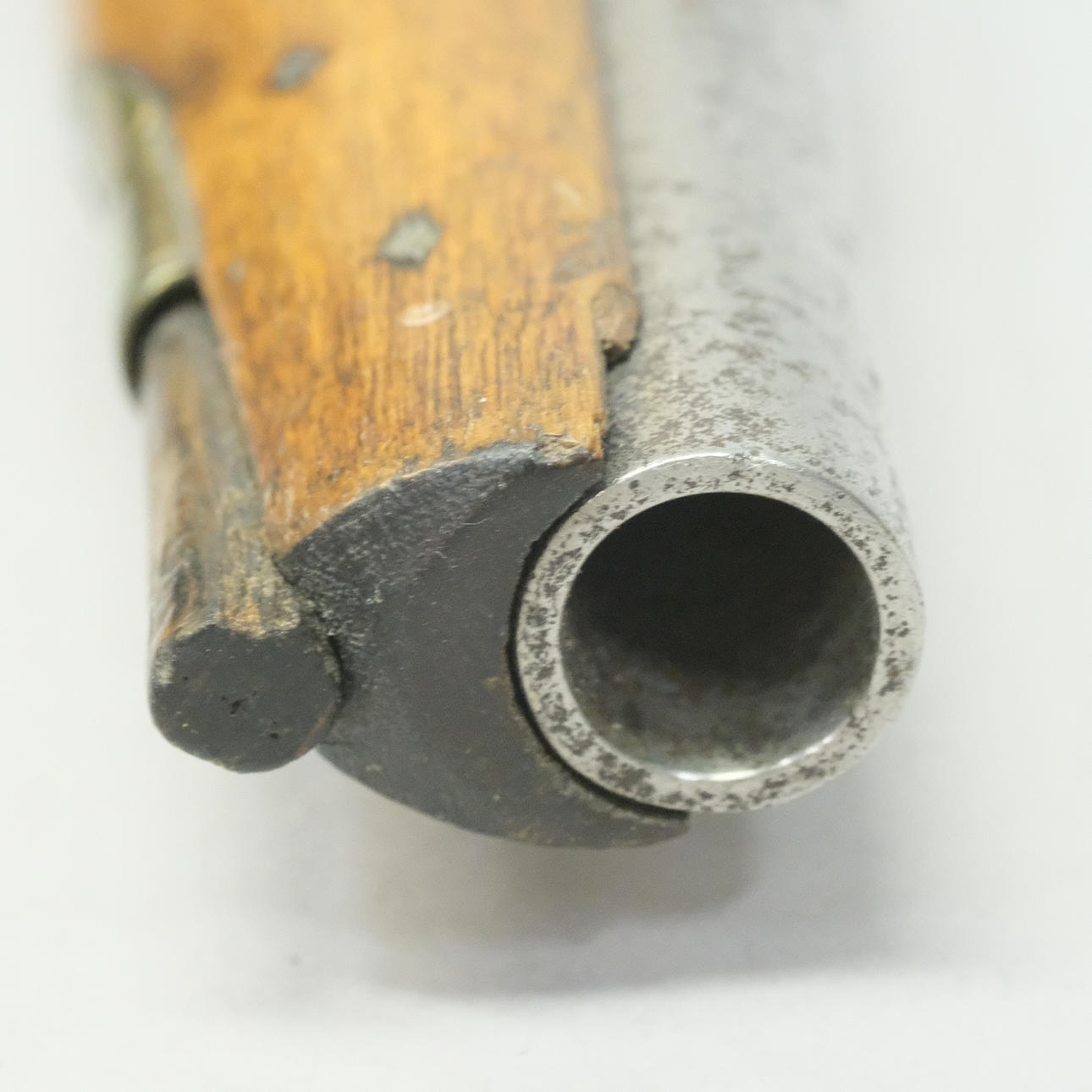 Nussbaumflasche mit Messing- und Stahlbeschlägen, Stahlfass, Ladestab, Länge 22 cm.
