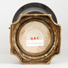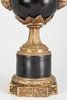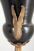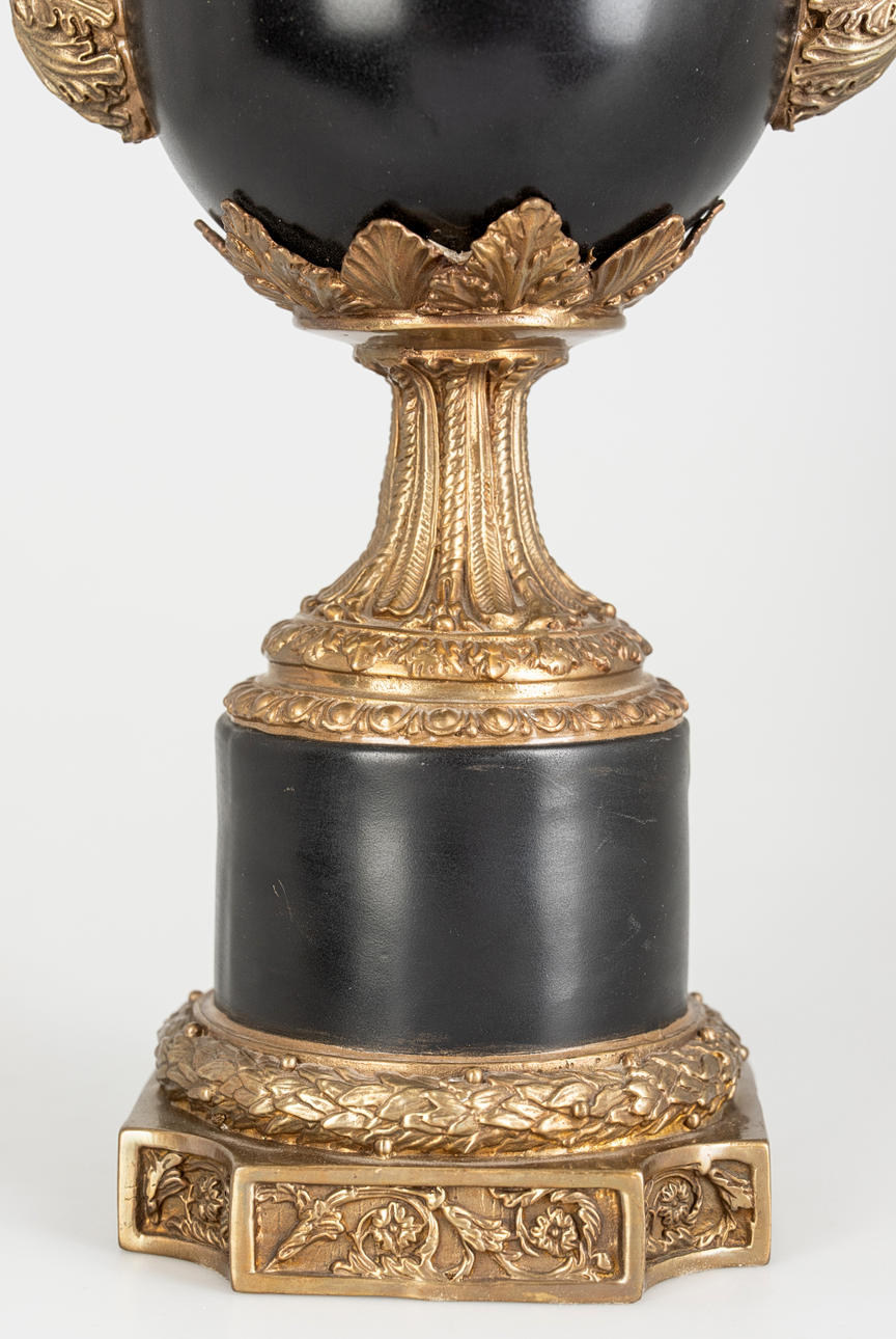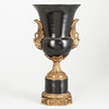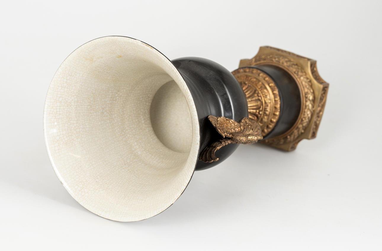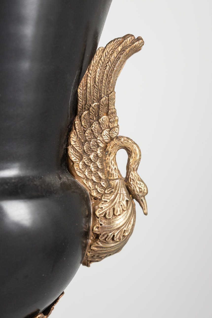Metallguss/Keramik, schwarz und grauweiß glasiiert und tlw. craqueliert. Zylindrischer, glatter Sockel auf quadratischer Plinthe mit eingezogenen Zwickeln und Lorbeerfries. Umlaufendervegetabiler Rankenfries. Der Metallfuß mit verschiedenen Reliefornamenten dekoriert. Seitlich applizierte, plastische Schwäne auf den Seiten der Kratervase. Herstellerstempel der Fa. G & C Interiors A/S, Dänemark. H: ca. 42 cm.