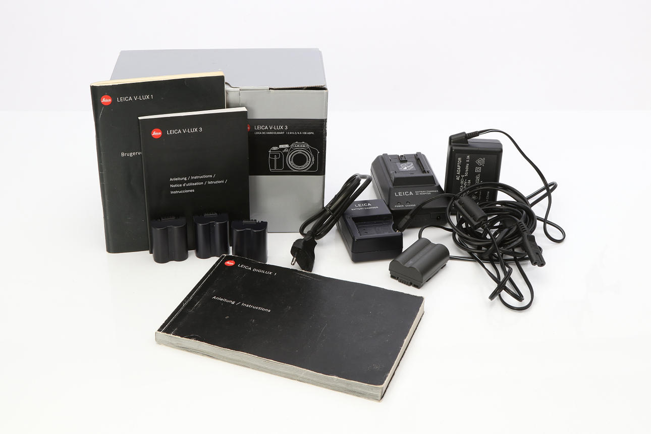 Bestehend aus Leica V-Lux 3, Leica V-Lux 1 und Leica Digilux 1. Länge 17 cm Verschiedene Broschüren, inklusive Batterien.
