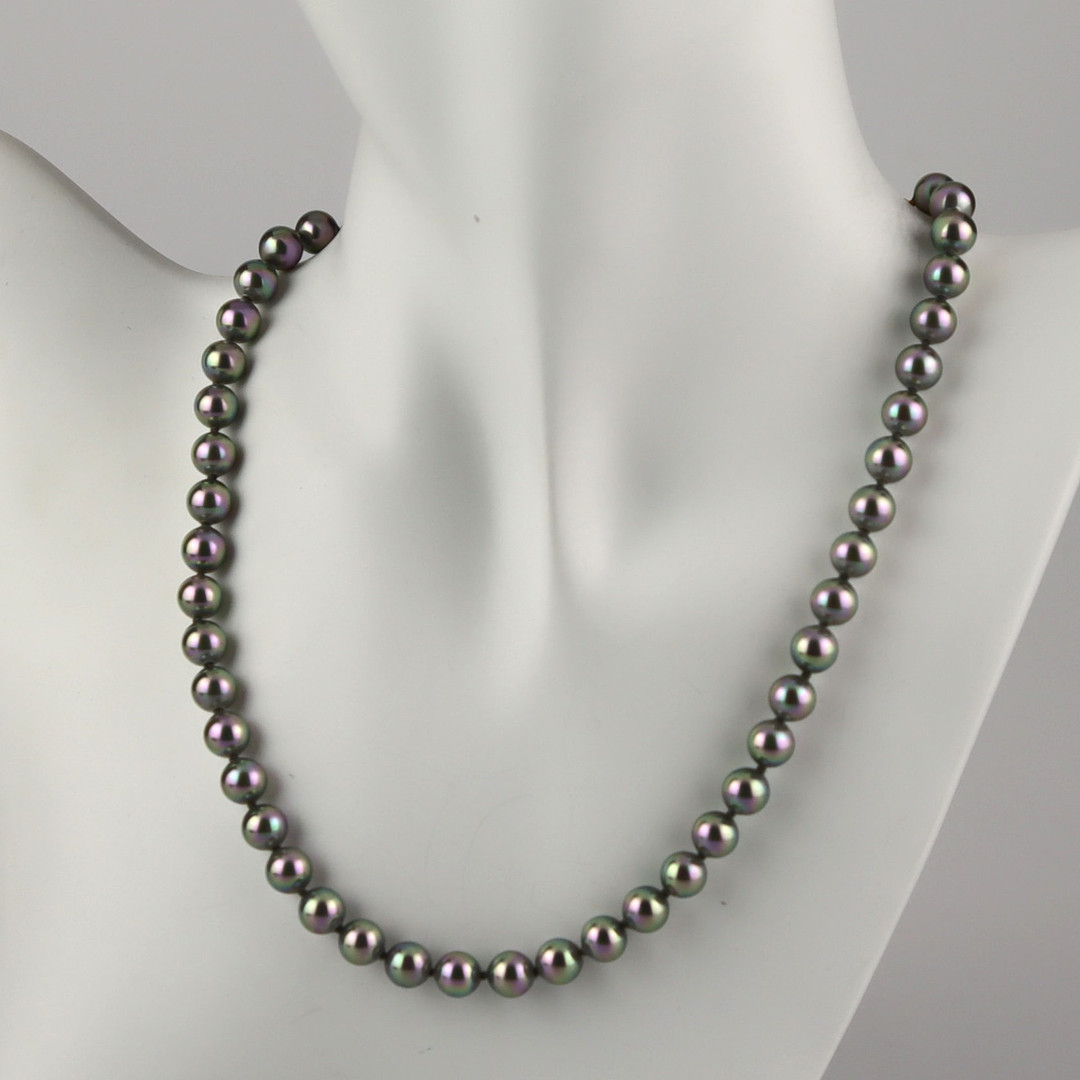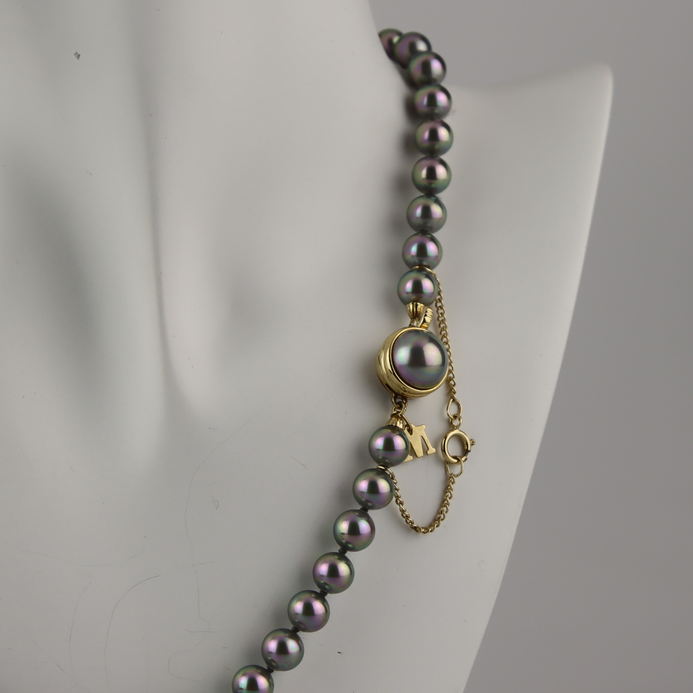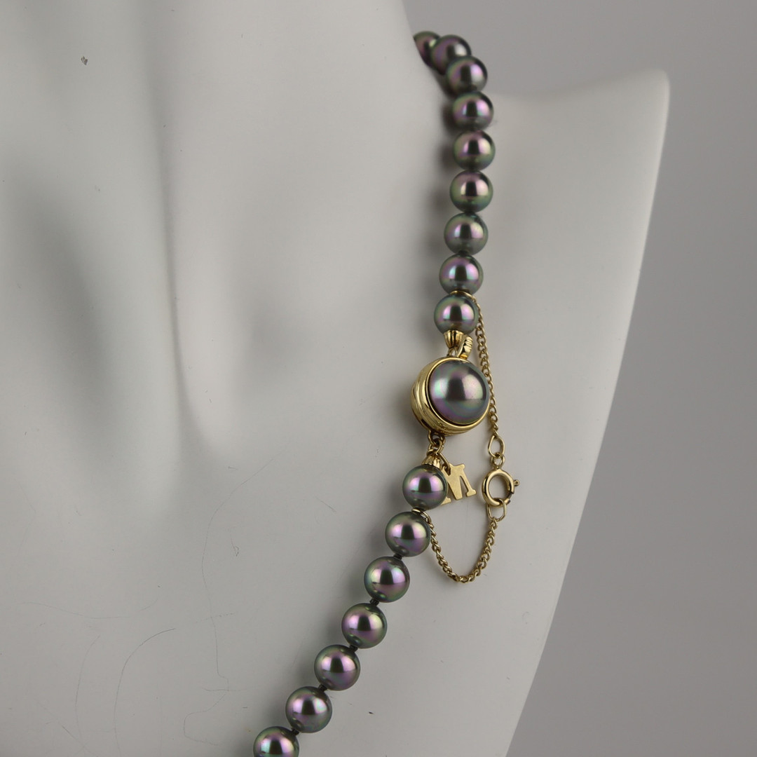 4134444. PERLENHALSKETTE, graue Majorica-Perlen, vergoldeter Silberverschluss.