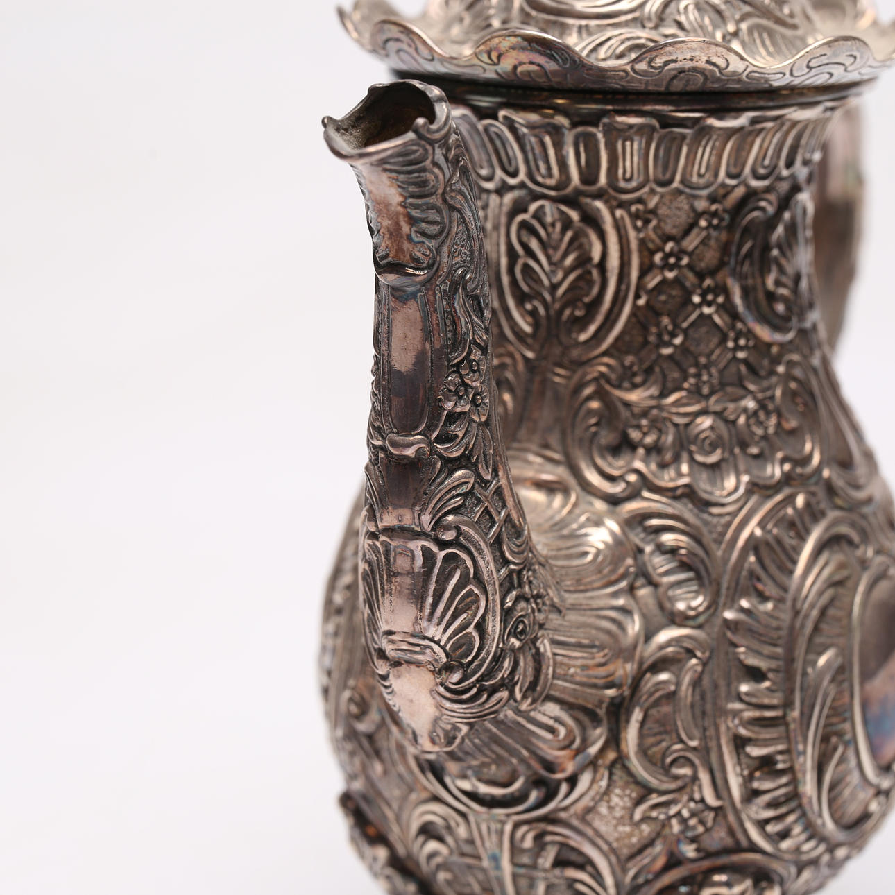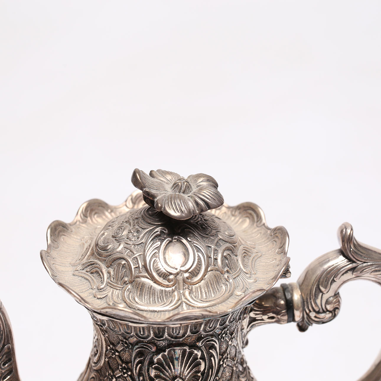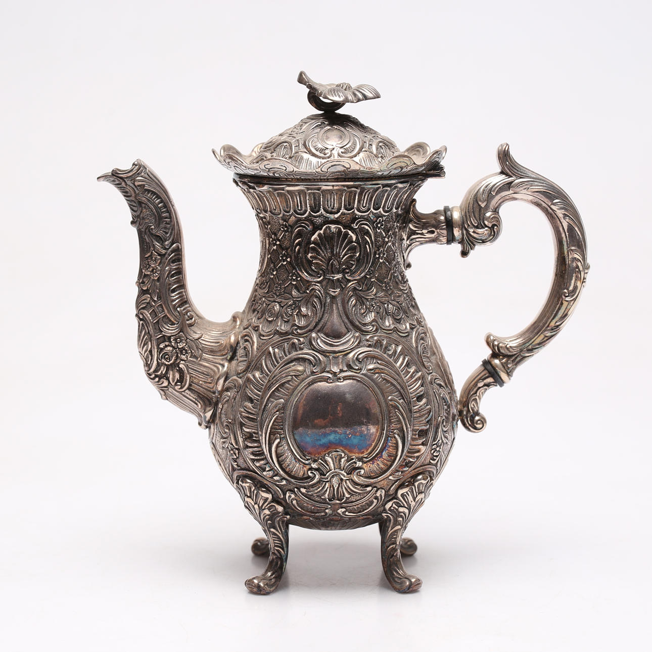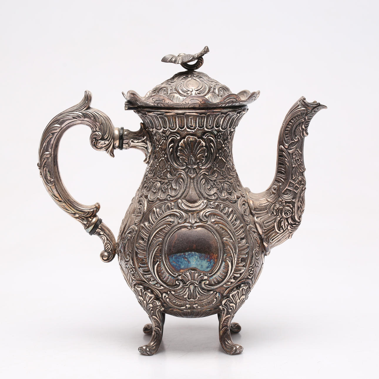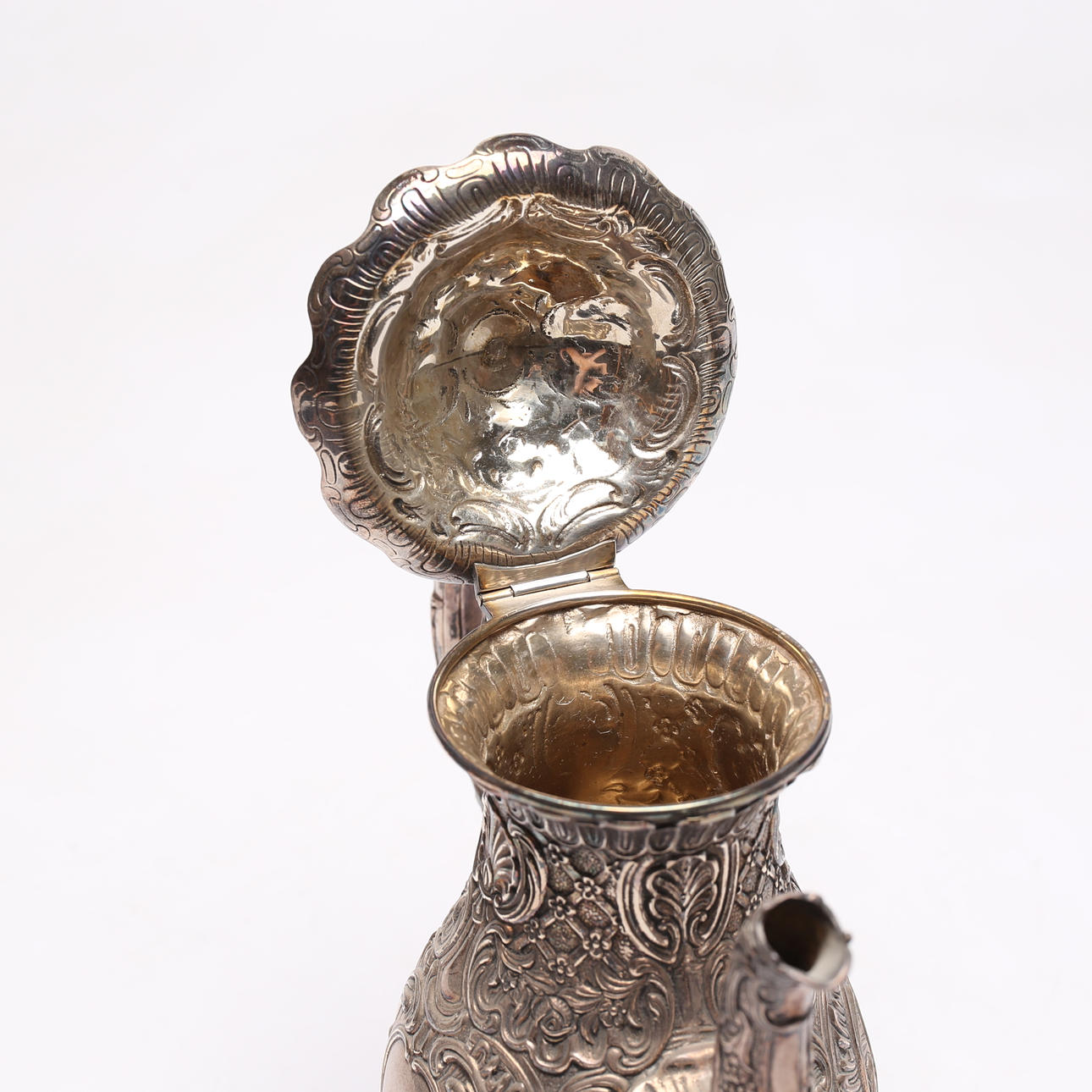4136006. KAFFEEKANNE, Silber, Rokoko-Stil, Gewicht ca. 912 Gramm.