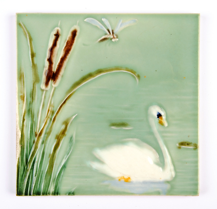 414076. JUGENDSTILFLIESE. Jugendstilkachel mit Schwan und Libelle.