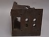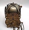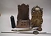 Messing/Eisen, Messingräderwerk, Gewichtszug, Schlag auf bekrönende Glocke im Messingbügel, Pendelaufhängung, Faltpendel mit runder Linse, 1 Gewicht, Ziffernring mit römischen Zahlen, mittig floral graviert,kunstvoll durchbrochene Zeiger, ausgeschnittene Delphin-und Floralbekrönung, Säulen auf Kugelfüßen,Maße des Gehäuses: ca.32x14x16cm, Ergänzungen, spätere Wandkonsole.