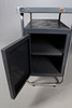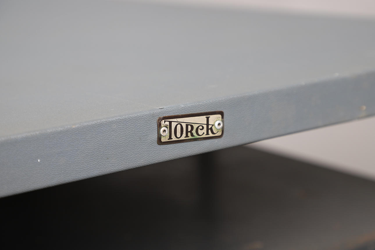 Ein industrieller Schreibtisch mit einem Stahlrohrrahmen, der eine rechteckige Platte trägt, mit drei Schublade auf einer Seite und einem eintürigen Schrank. Mit einem Herstellernamen auf der einen Seite, „Torck“. 130 cm x 65 cm, 74 cm hoch.
