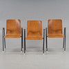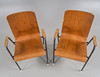 Schwarz lackierte Stahlrohre. Geformte Sitze, mit Teakholz furniert. Stapelbar