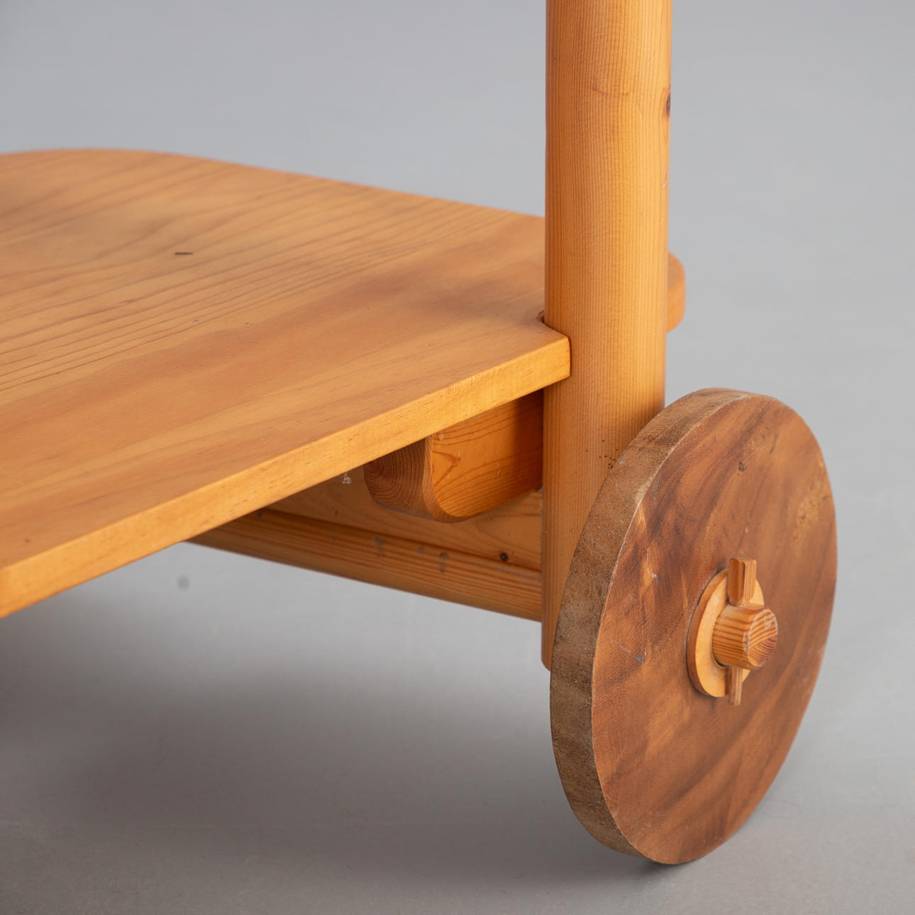 Massives Kiefernholz, auf Rollen, lenkbar.