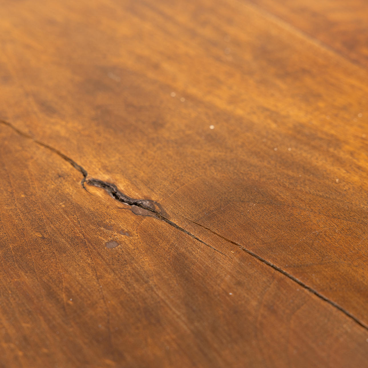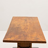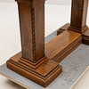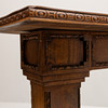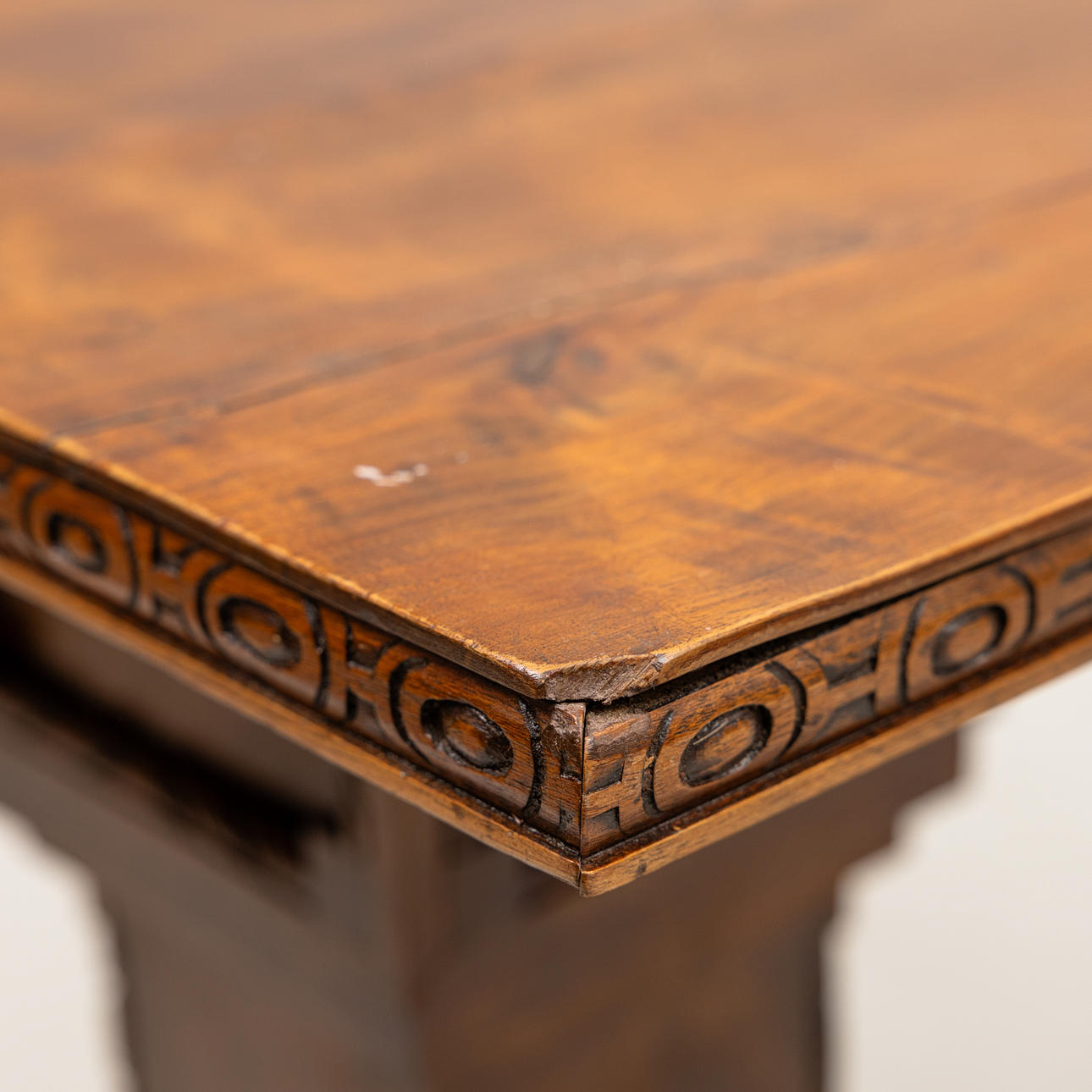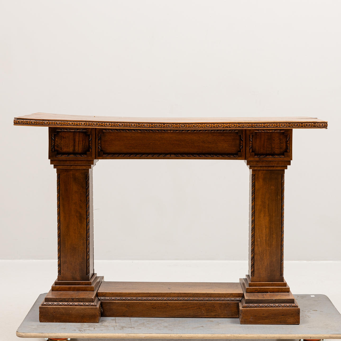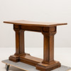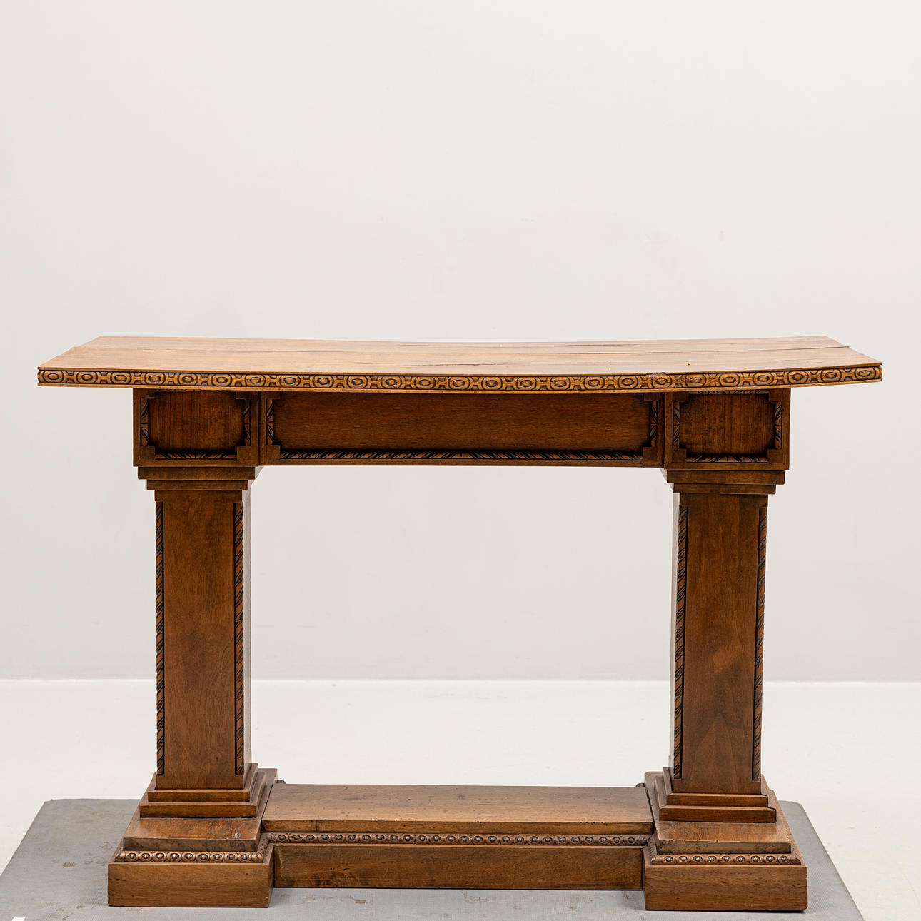 Längliche Form, zwei quadratische Beine, geschnittene Schnurdekore. Länge 110, Breite 49, Höhe 74 cm.