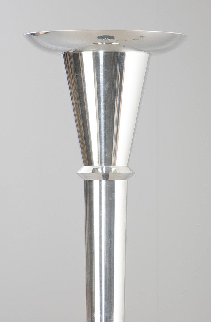 Trompetenförmiger Korpus aus Aluminium mit trichterförmigen Fluter. Schwerer, geschwärzter Tellerfuß.