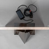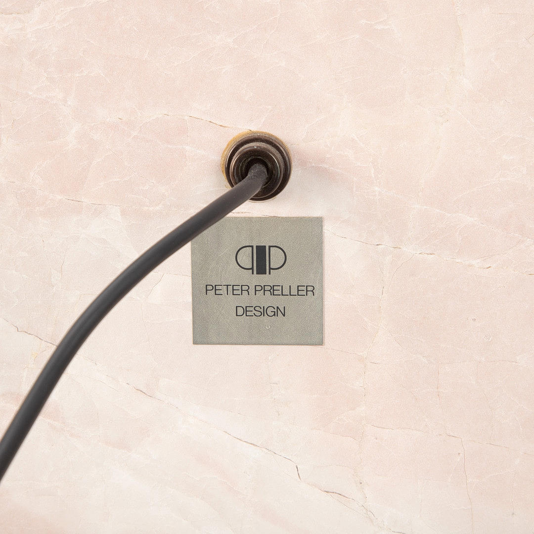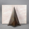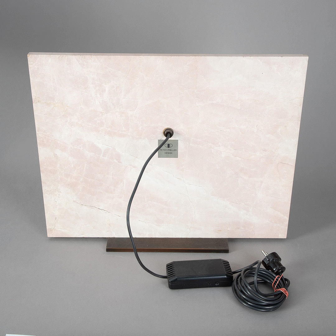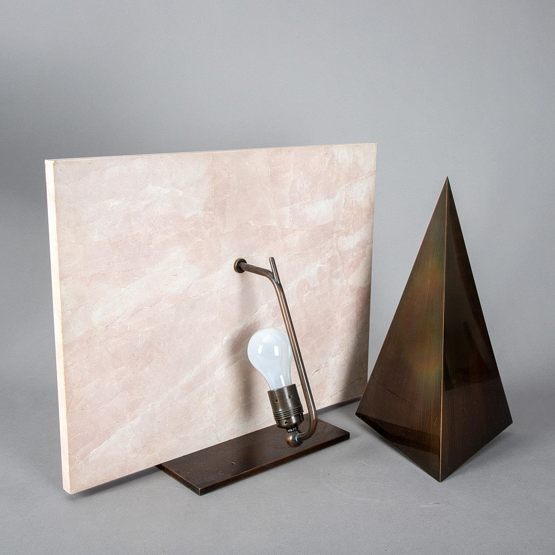 Rechteckige Sockelplatte mit im rechten Winkel aufrecht montierte Natursteinplatte. Abnehmbarer Dreieck-Lampenschirm aus bronziertem Metall.