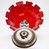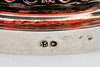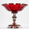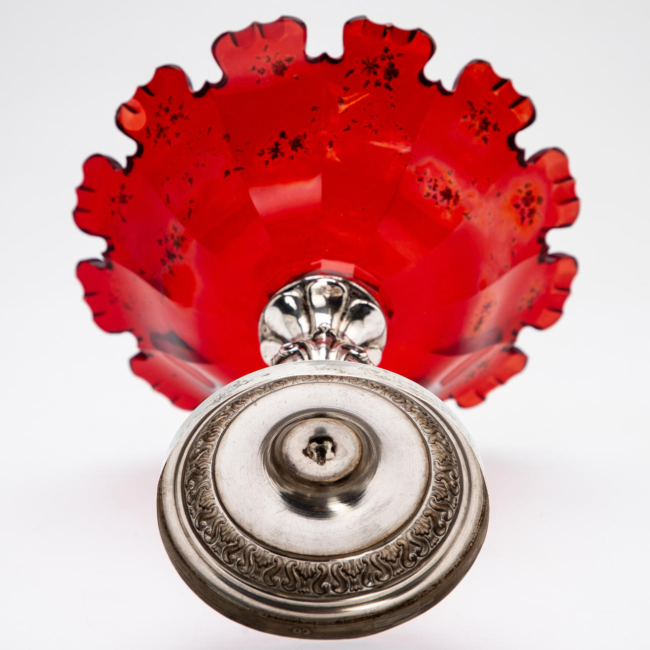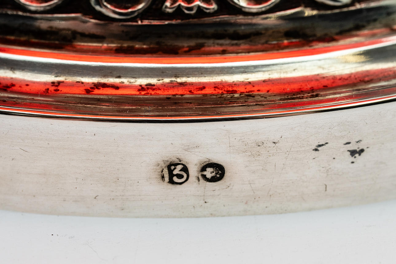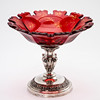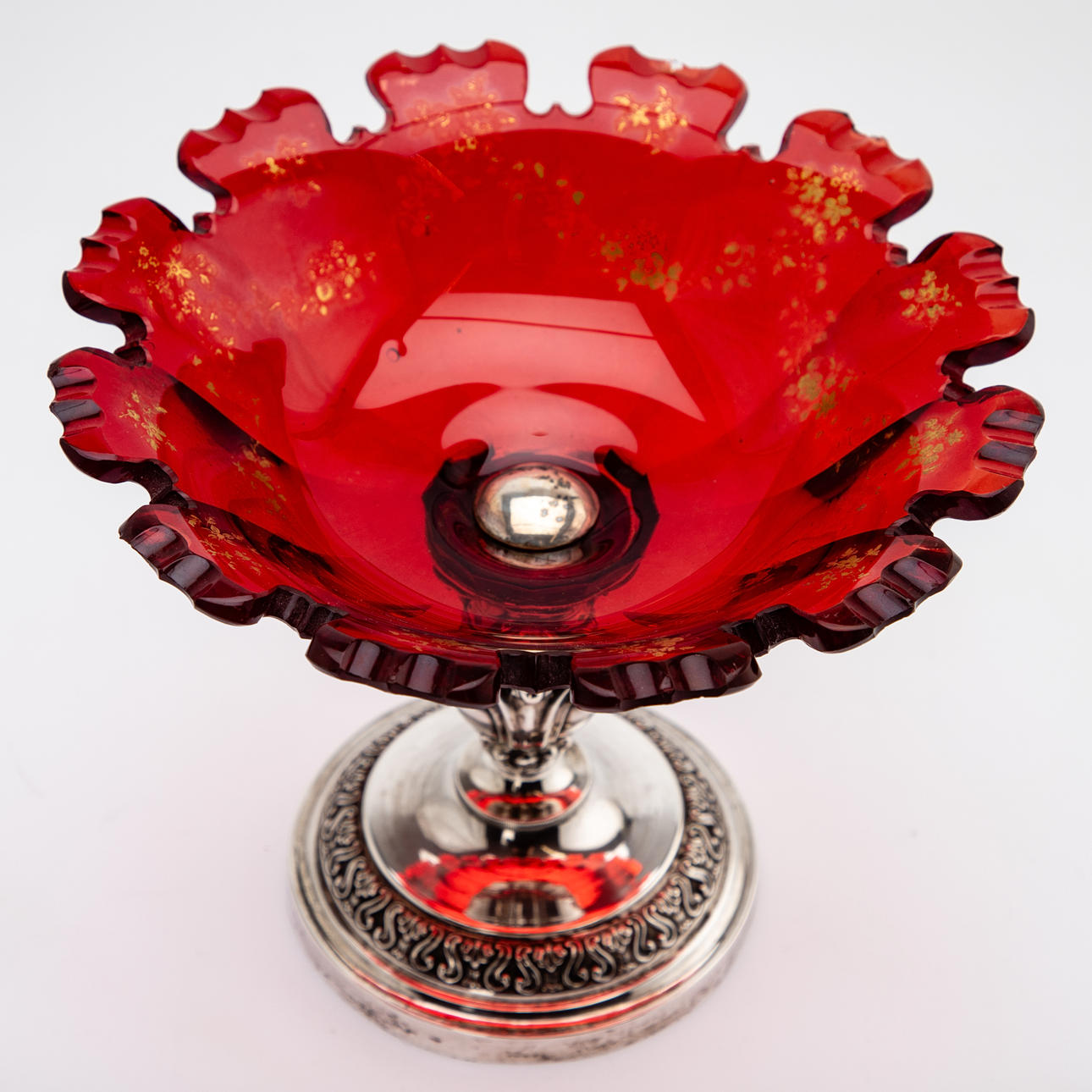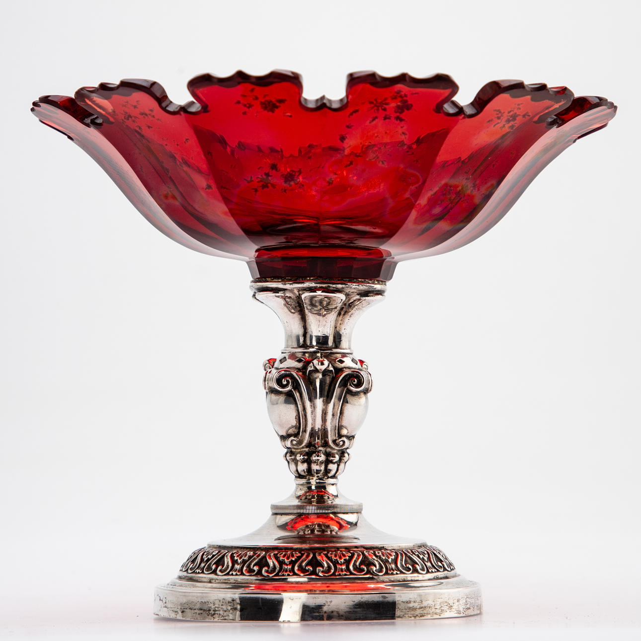 13-lötiges Silber, rotes Kristallglas mit Goldmalereien. Runder, konisch aufsteigender Hohlfuß mit umlaufendem Ornamentfries im Relief. Der balustierte Schaft durch drei passige Rollwerkkartuschen gegliedert. Gemuldete Glasschale mit Kantenschliff und zungenartig ausgeschliffenem Rand. Innen feine Blumenranken in Gold. Silberstempel. HxDm: ca. 15,5 x 17,5 cm.