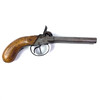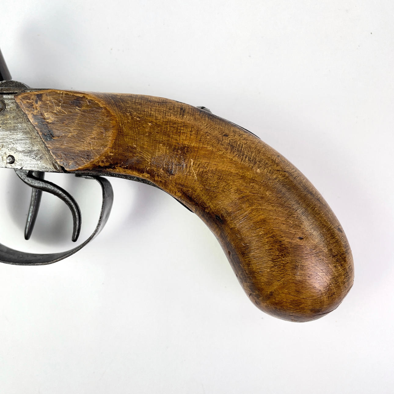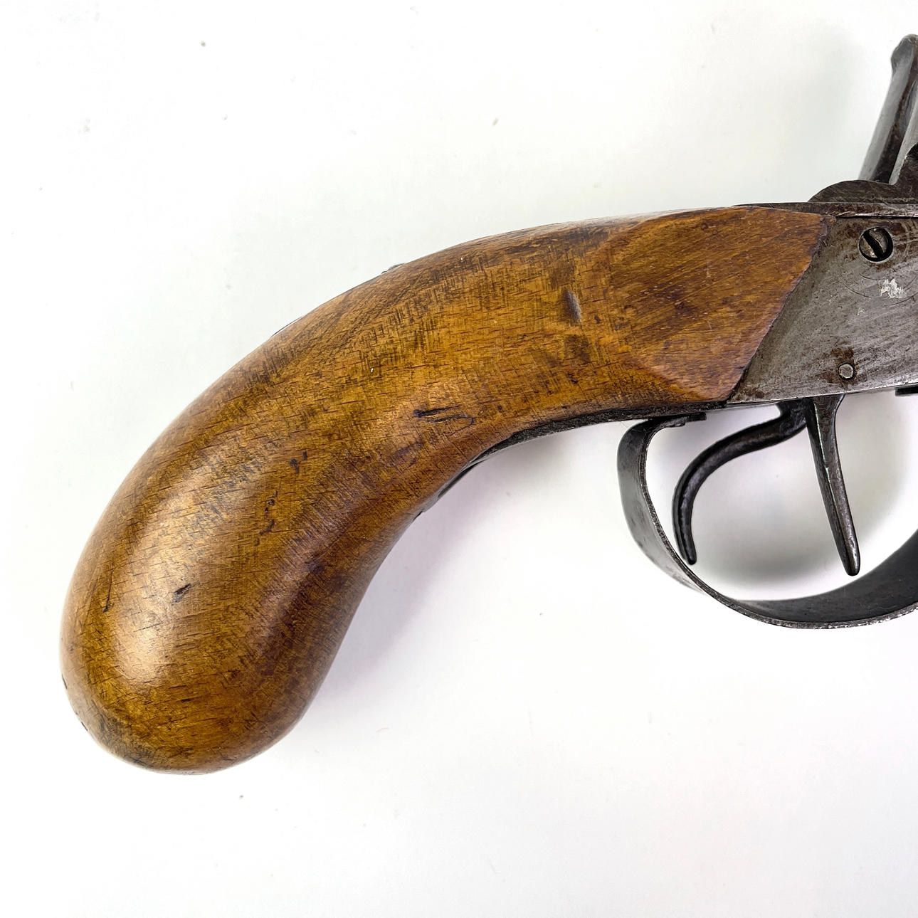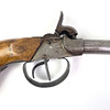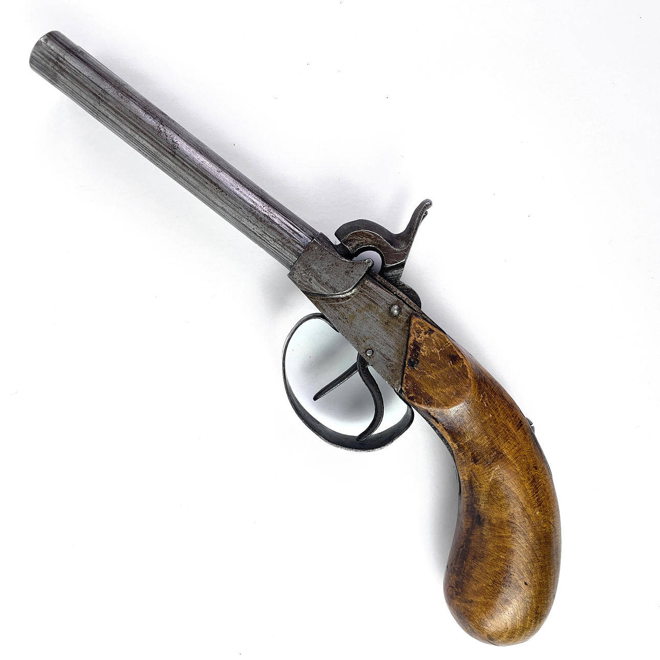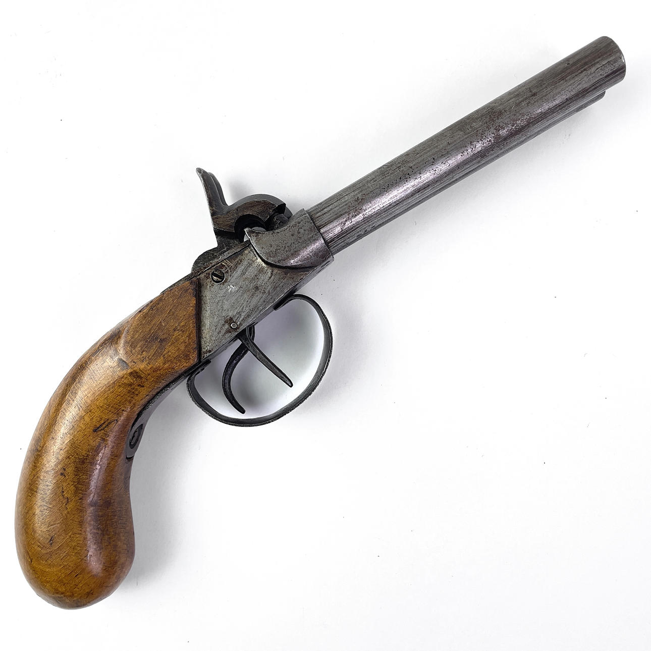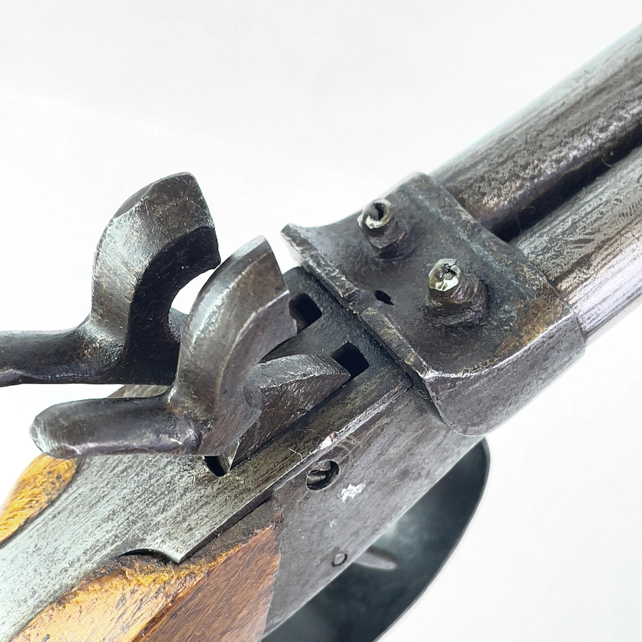 Hubsperre. Mit unklaren Kontrollstempeln und Zahlen gekennzeichnet, Kolben aus Holz, Lauf rund gebohrt und Mechanik aus Stahl, Gesamtlänge ca. 24 cm, Kaliber ca. 10 mm. Wahrscheinlich belgisches Modell.