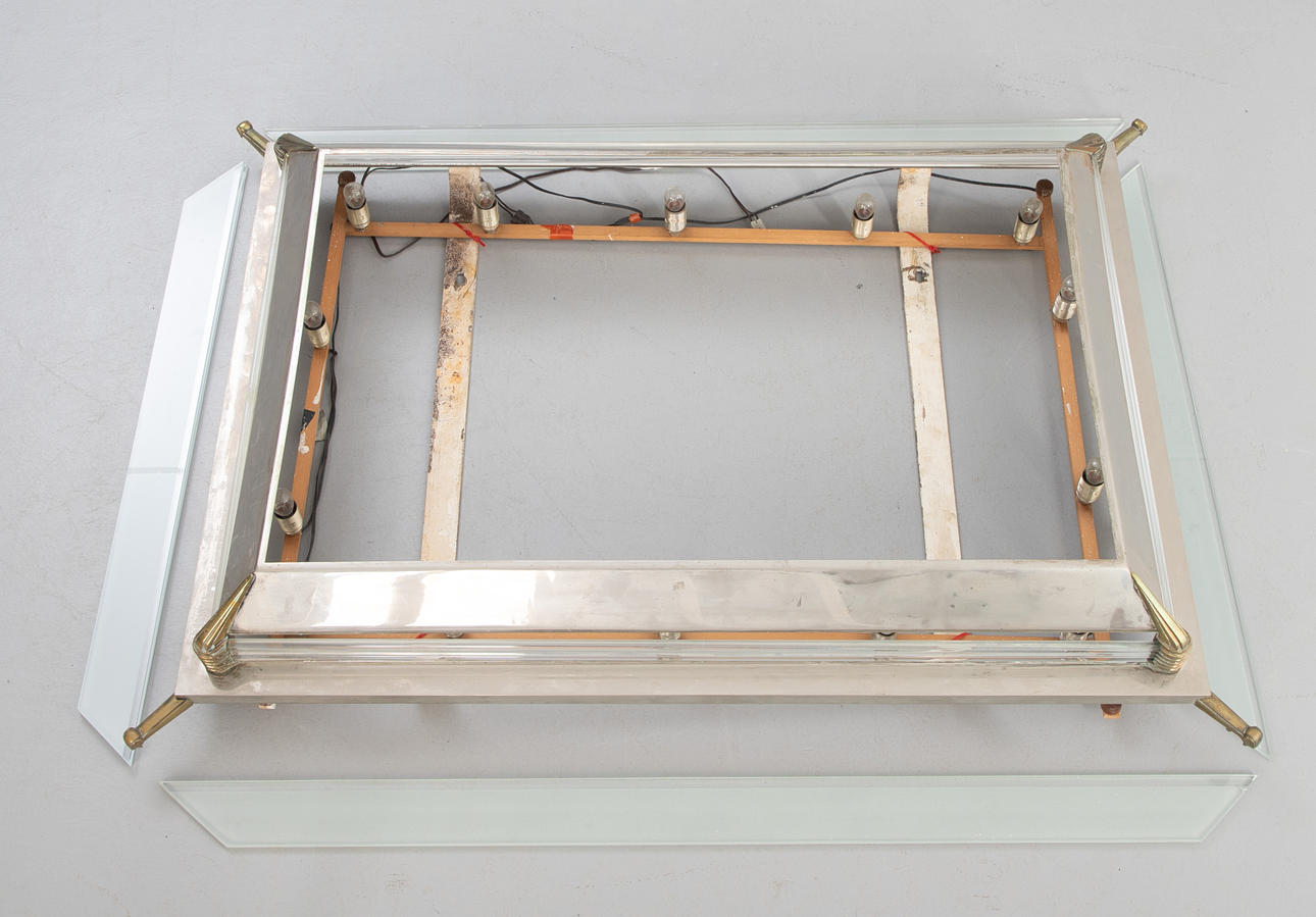 Gebrauchsspuren, Bestoßungen im Glas. Ein Glasstab lose, eine Reihe mit Glasstäben durchgebrochen und mit Kleberband fixiert.