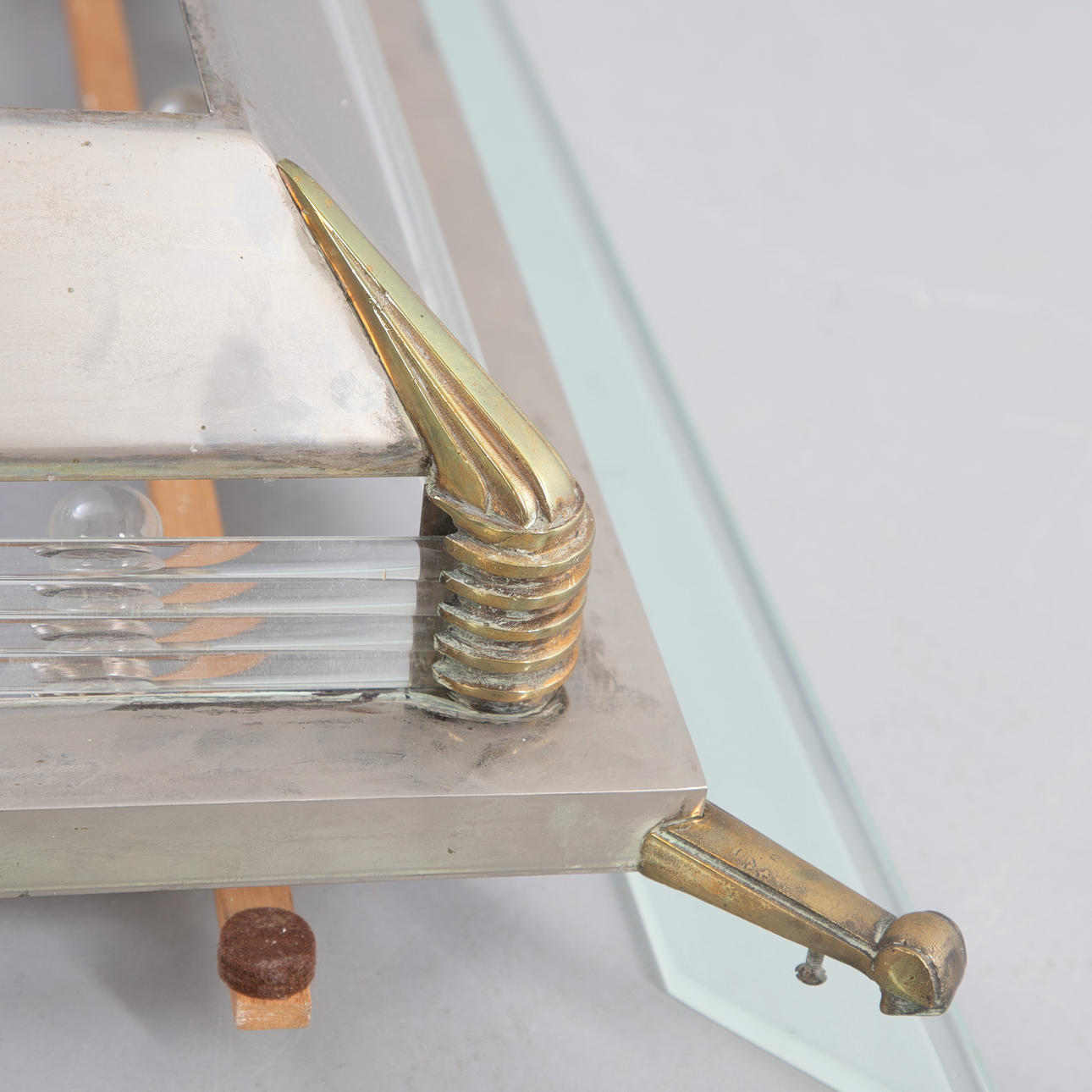 Metall, vernickelt / Glas. Originale und ergänzte Teile. Wandung mit horizontal angeordneten Rundstäben aus farblosem Glas. Glaseinsätze später. 14-flammig, elektrifiziert.