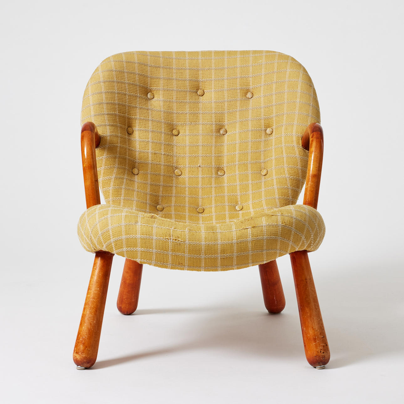 ARNOLD MADSEN. ZUGESCHRIEBEN. Sessel, „Muslingestolen/Clam Chair“, entworfen 1953, gepolsterter und gepolsterter Sitz, Beine und Armlehnen aus gebeiztem Holz, das Modell, das zuvor Philip Arctander zugeschrieben wurde.
