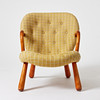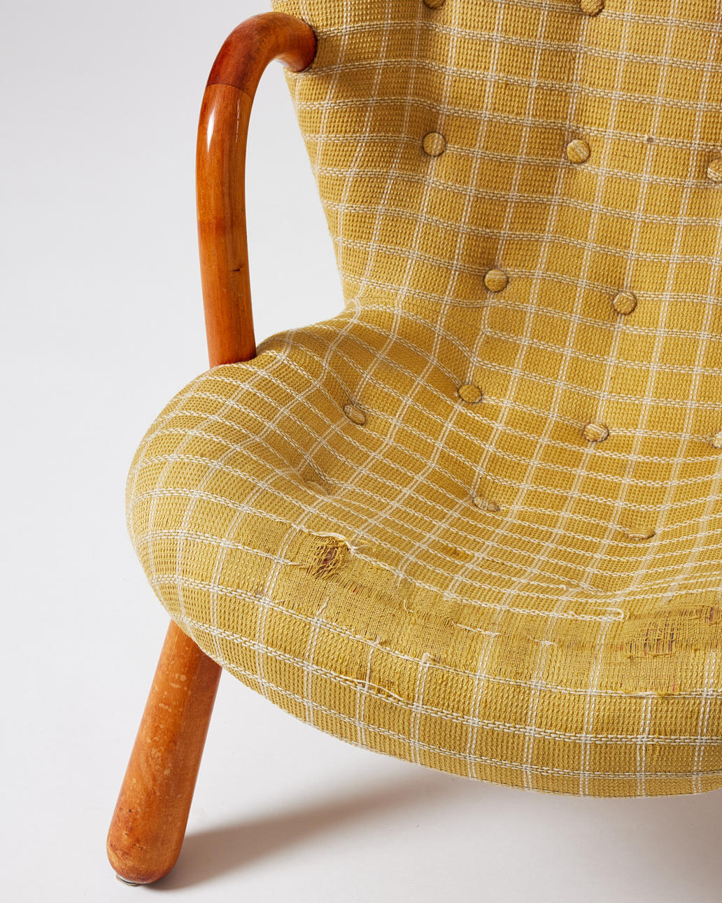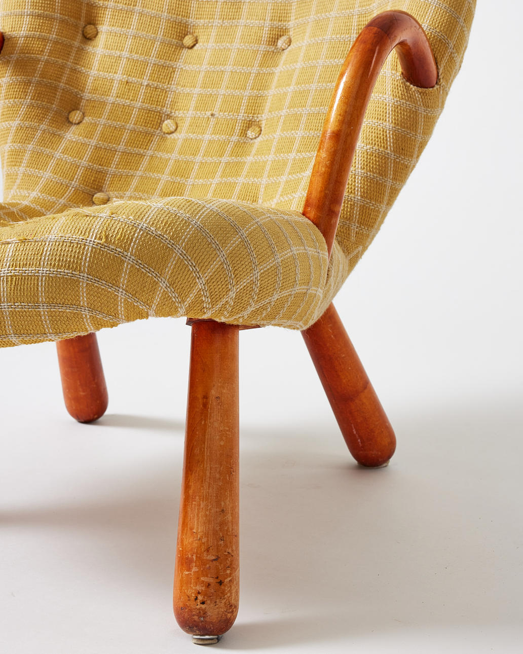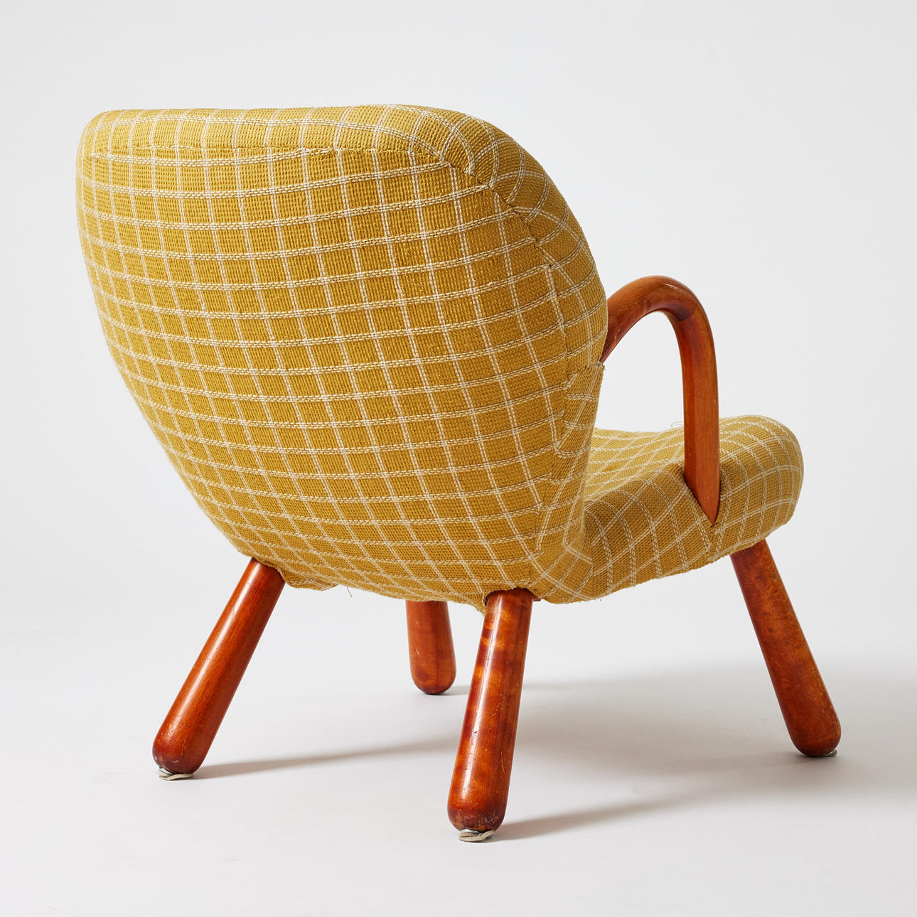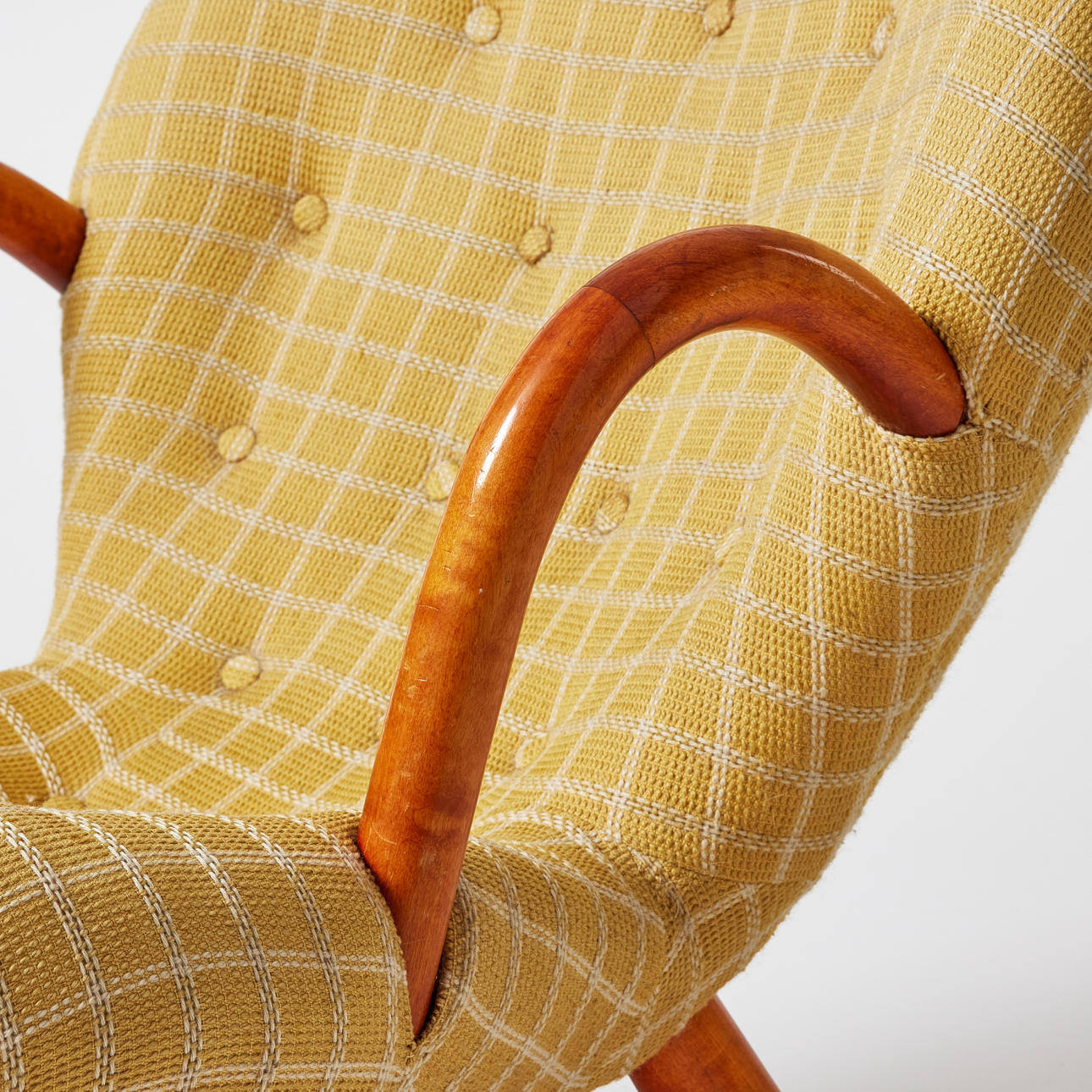 4186582. ARNOLD MADSEN. ZUGESCHRIEBEN. Sessel, „Muslingestolen/Clam Chair“, entworfen 1953, gepolsterter und gepolsterter Sitz, Beine und Armlehnen aus gebeiztem Holz, das Modell, das zuvor Philip Arctander zugeschrieben wurde.