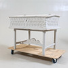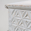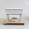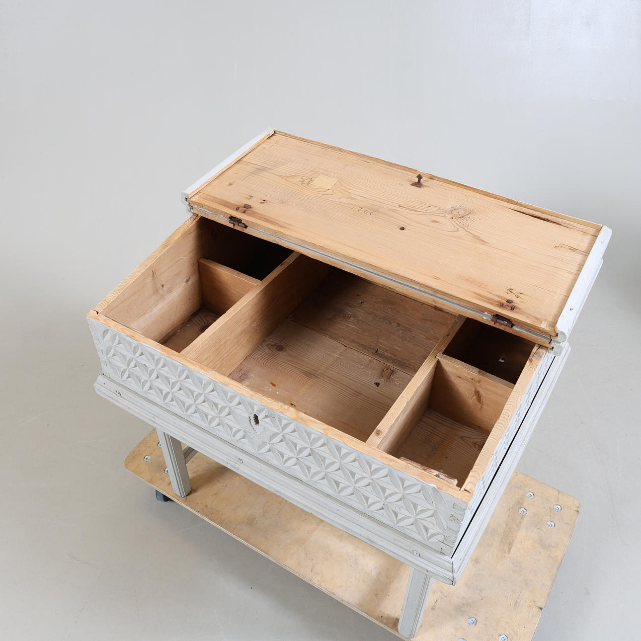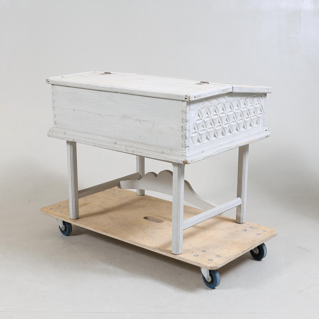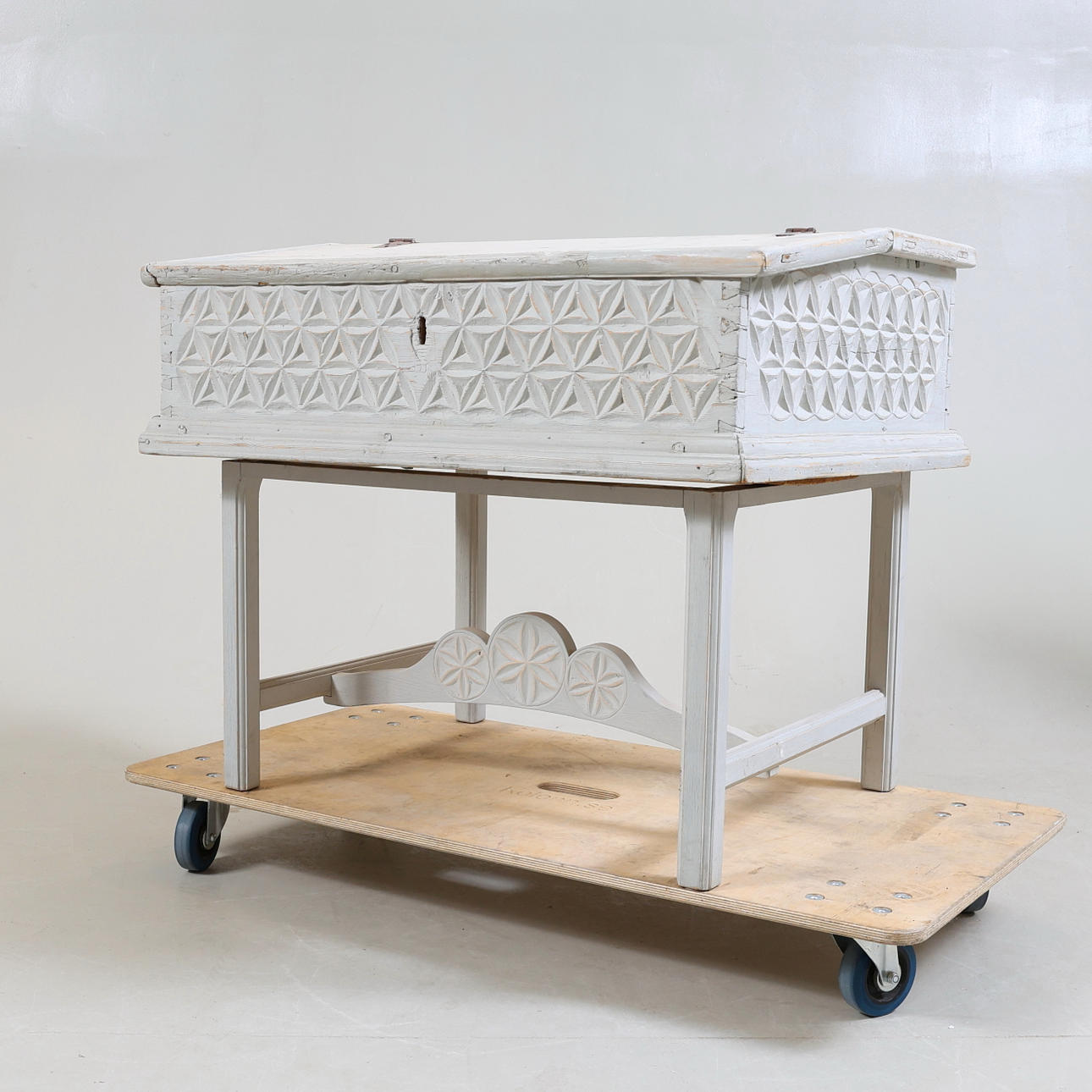 Der Schreibtisch mit geschnittenem Dekor, bemalt Länge 89,5, Breite 71, Höhe 75,5 cm.