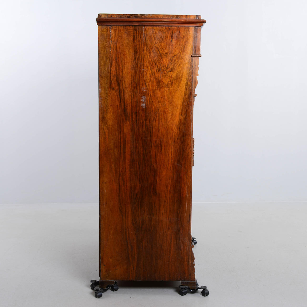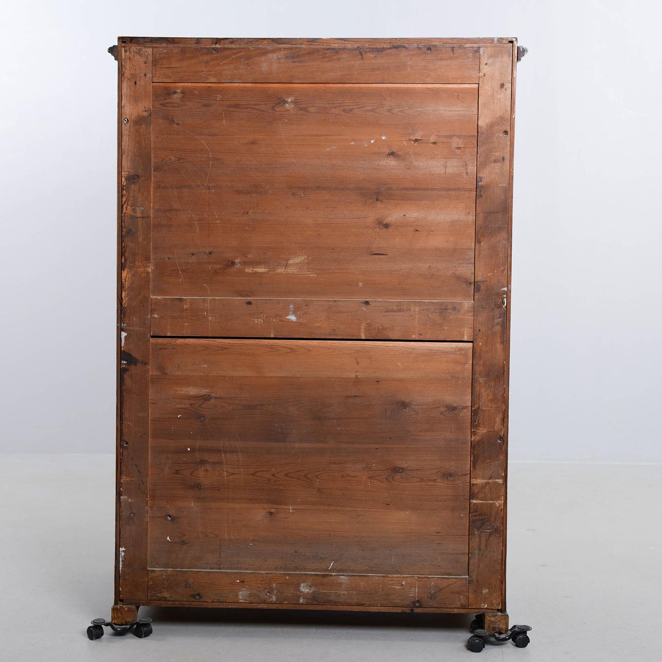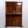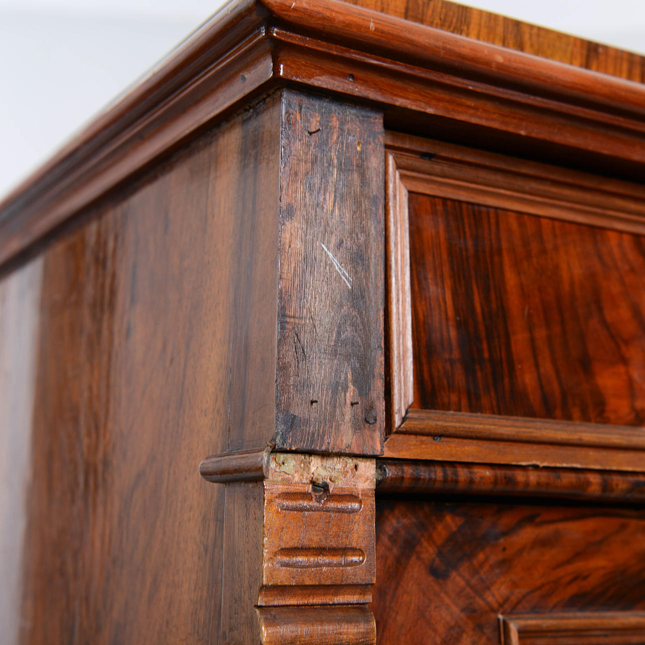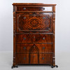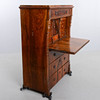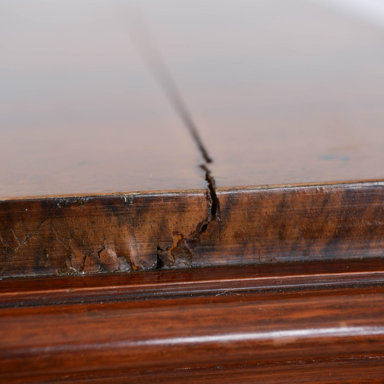 Gebrauch und altersbedingte Abnutzung. Risse. Es fehlt ein Knopf an der inneren Ausziehbox. Beschädigung des Dekors auf einer Seite.