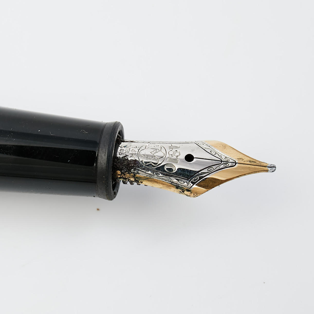 Leichte Gebrauchsspuren, getrocknete Tintenrückstände an den Stiften, Tintenhalter mit Rissen (siehe Bild).