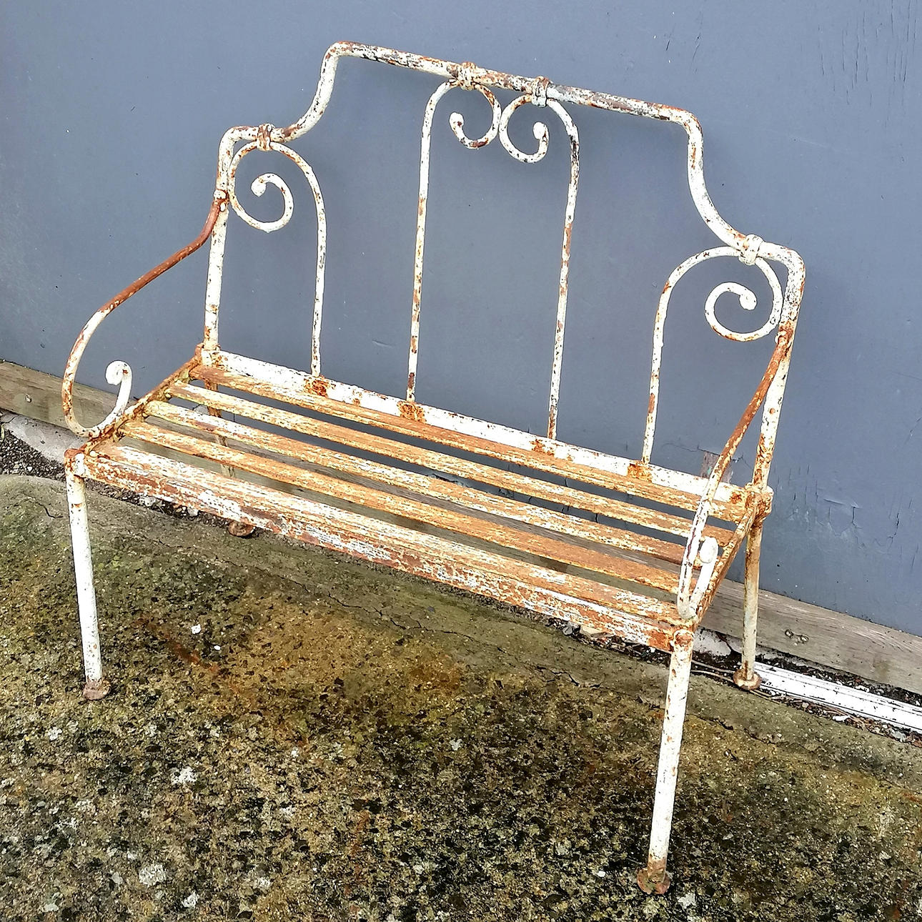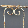 Antike schmiedeeiserne Kinderbank mit Gurtarbeitssitz.
