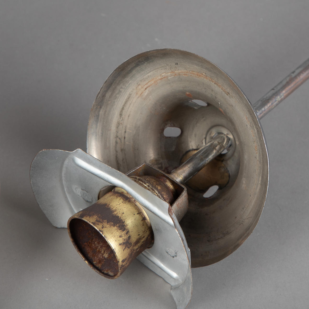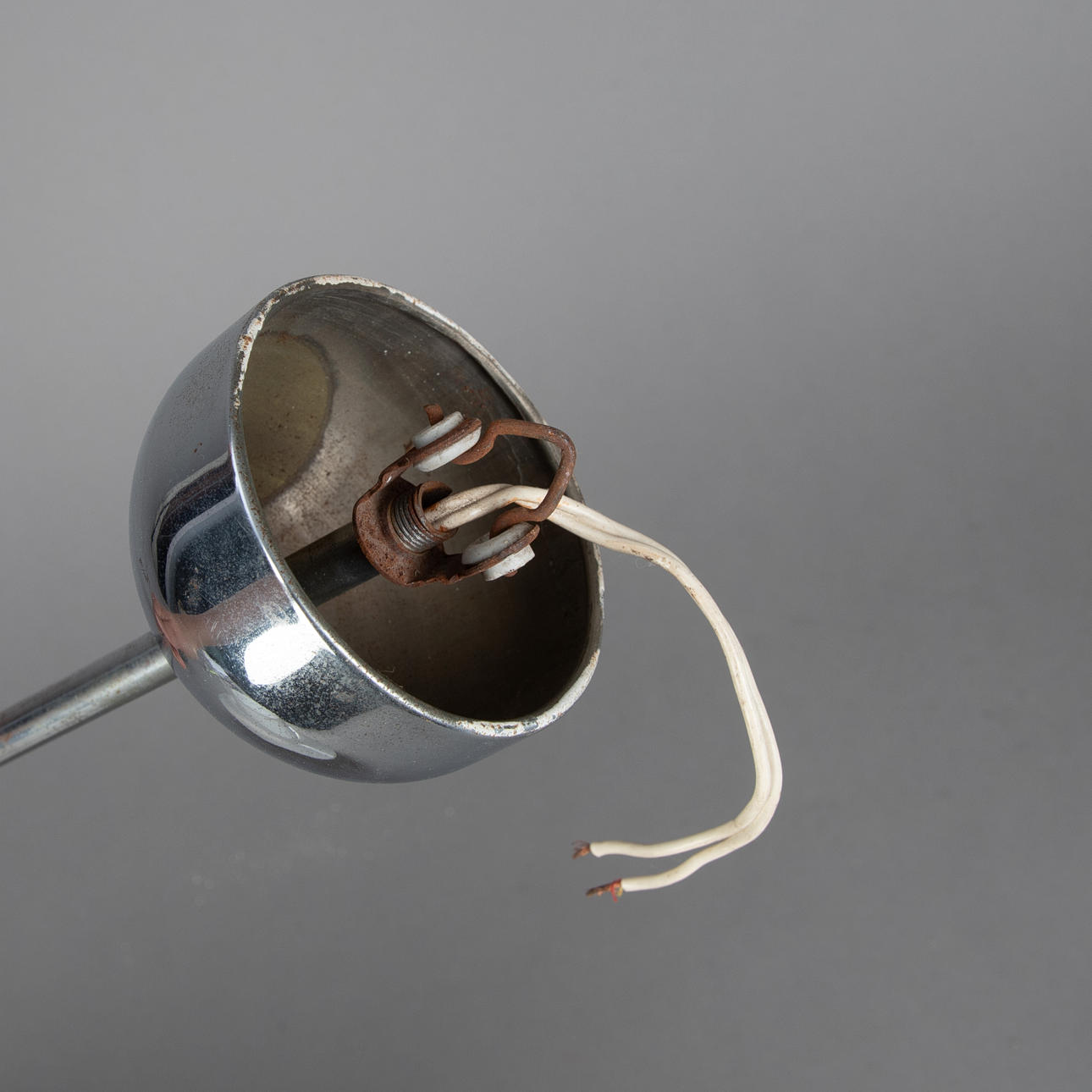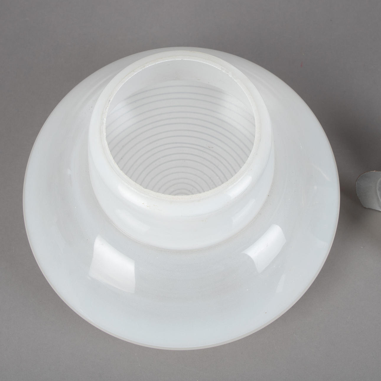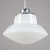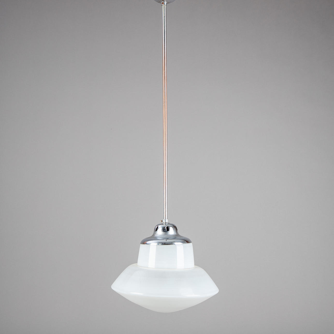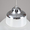 Gestell und Halterung aus Metall, verchromt. Schirm aus Opalglas. Eine Brennstelle.