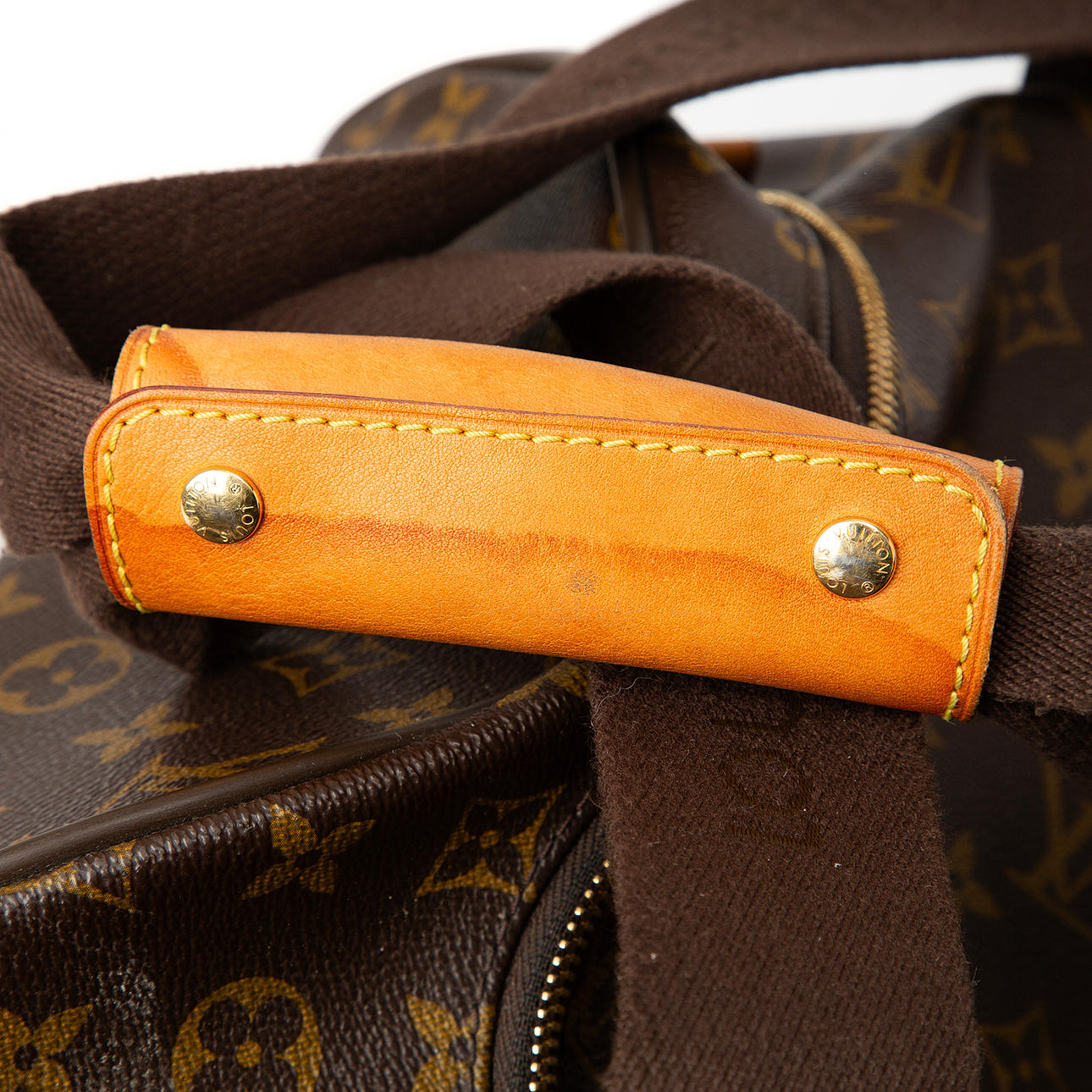 Mit Monogrammmuster und cognacfarbenen Lederdetails. Mit LV-markiertem Vorhängeschloss. Innenseite nylonbeschichtet Kann gerollt oder getragen werden. Mit Schloss und Schlüssel.