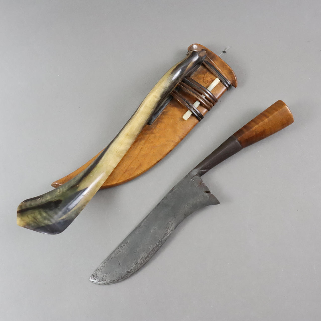 breite, flache Klinge mit leicht s-förmig geschwungener Schneide, Spitze geschärft, schön polierter mehrkantiger Holzgriff in langer Tülle, Scheide aus hellem Tropenholz mit sorgsam gearbeitetem großem Gürtelhaken aus Büffelhorn, gehalten durch Rattanbindung, Klinge ca. 16,5 cm, Gesamtlänge mit Scheide und Haken ca. 42 cm.
