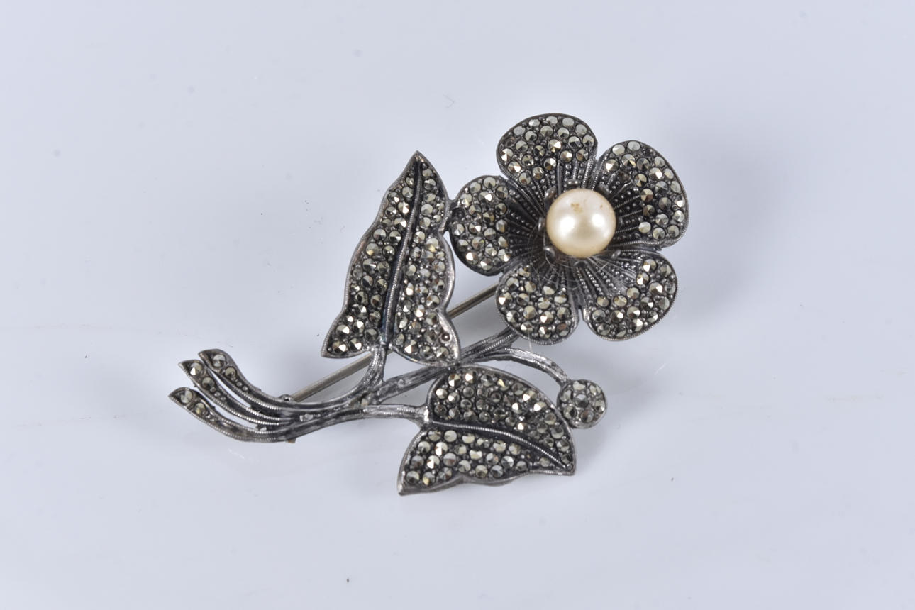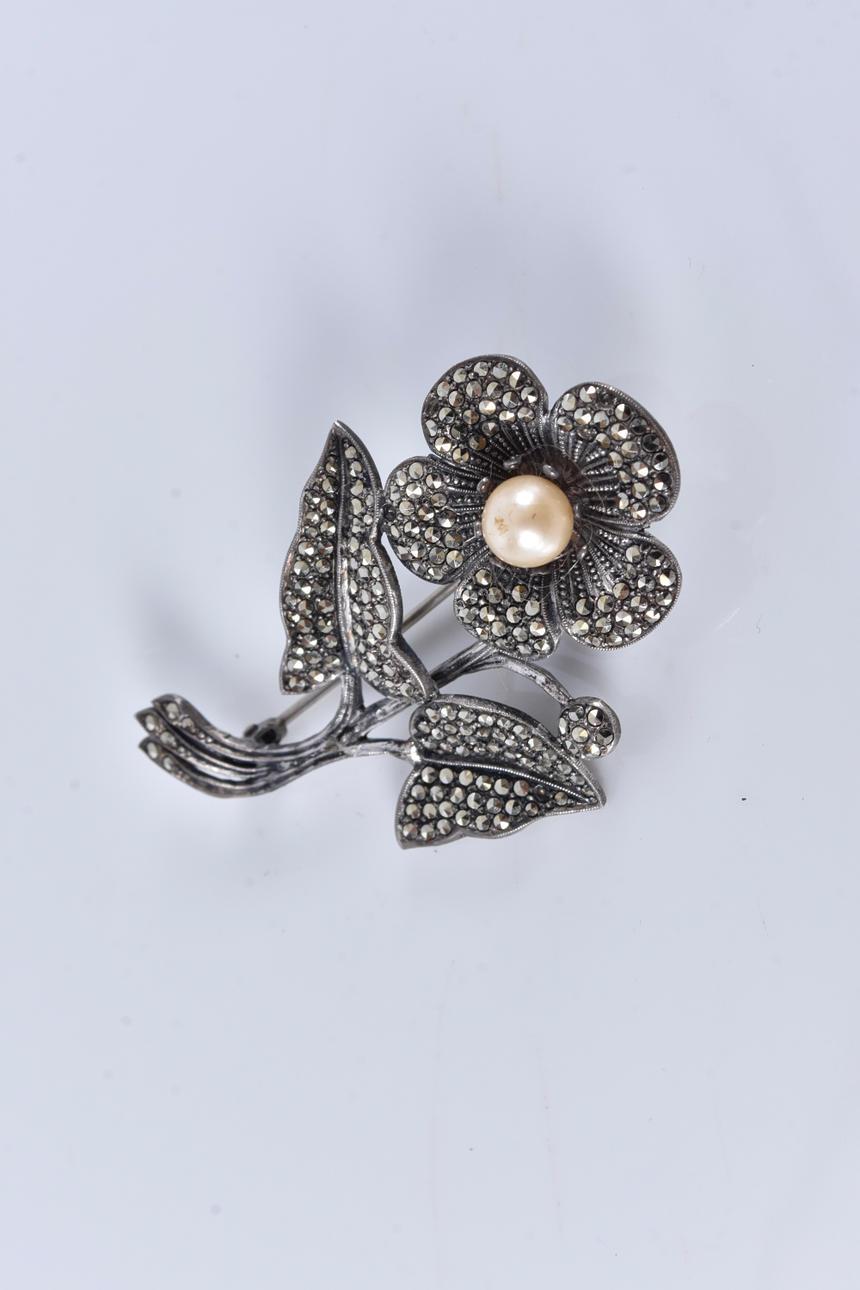 4219439. BROSCHE, mit Markasiten und Perle, Silber.