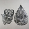 wohl Leder, kunstvoll scherenschnittartig ausgeschnitten und schwarz lackiert, Blattform mit Vogel-und Drachenmotivik im Gunungan-Stil, ca. 56,5 x 37,5 cm, guter Zustand / 1x Garuda mit Schlange, gewellt, kleine Fehlstellen, Abrisse, leichter Abrieb, ca. 43 x 37 cm, beide lose, Indonesien, 20.Jh.