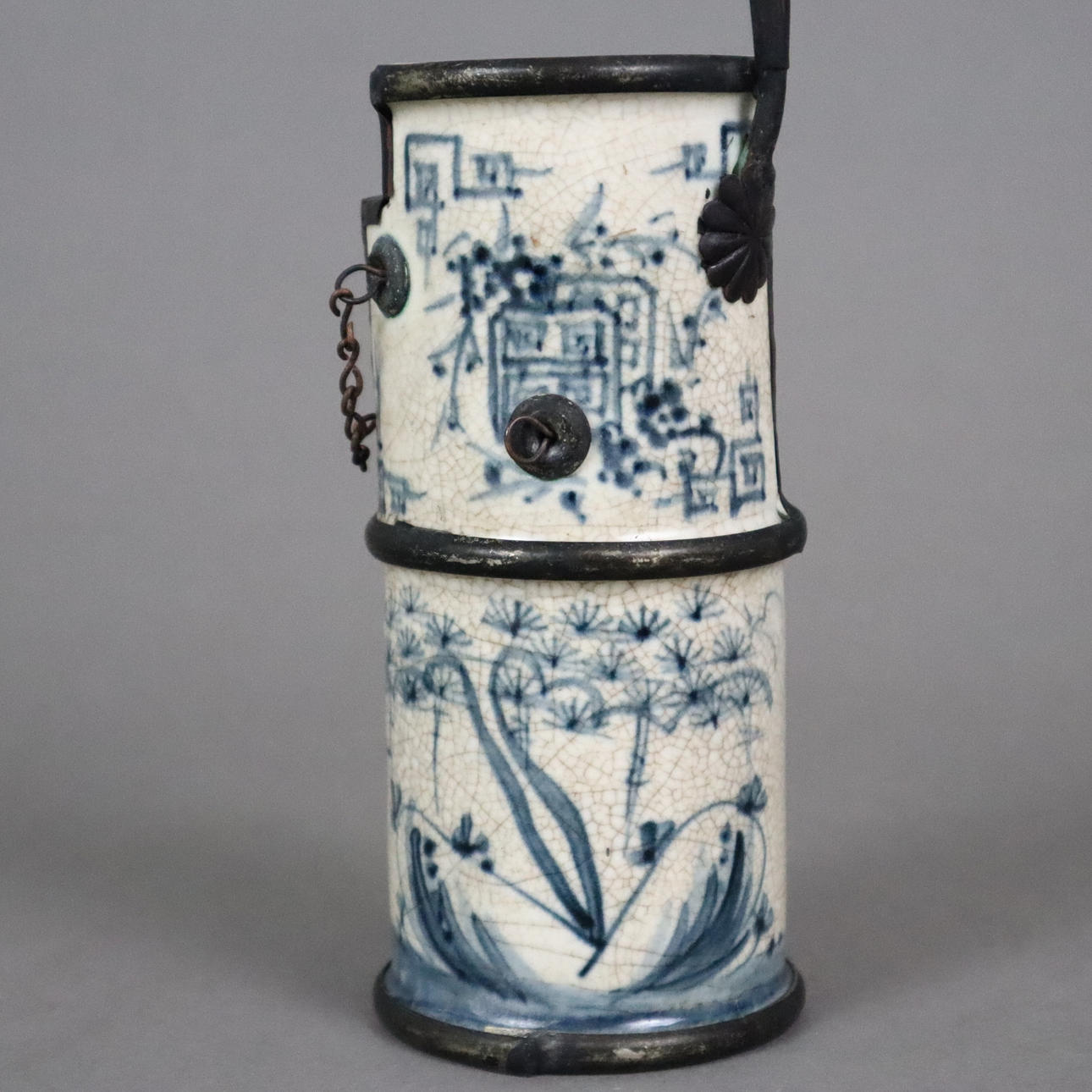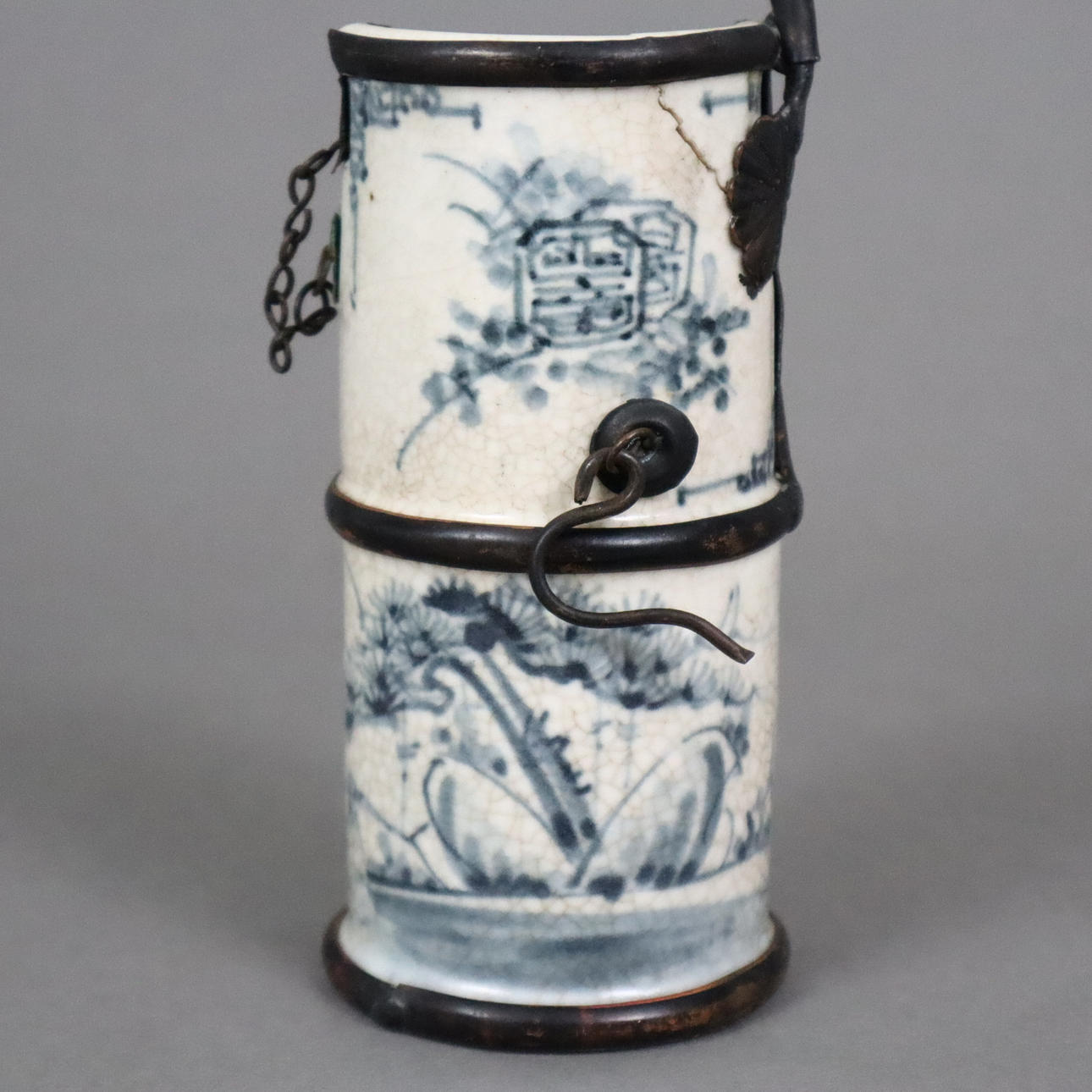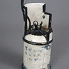 Drei Opiumpfeifen - Porzellan, auf hellem Grund Landschaftsszenen in Blau bzw. Schwarz, teils Schriftzeichen, Metallmontierung, im Boden gemarkt, jeweils mit abnehmbarem Pfeifenhals, H. ohne Pfeifenstiele 11,5-15,5 cm.