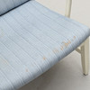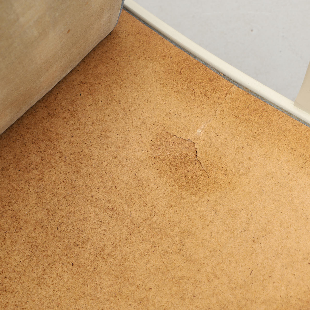 Abnutzung und Abnutzung. Teilweise abgenutzte Polsterung, kleinere Flecken. Loses Masonitbrett im Sitz (eines mit Riss), darunter getrocknete Streifen. Leichter Farbverlust.