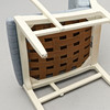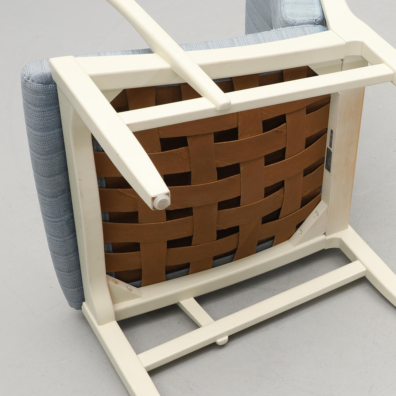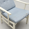 Weiß lackiert. Lose Kissen im Sitz und Rücken. Breite 62, Tiefe 75, Rückenhöhe ca. 95, Sitzhöhe 43 cm.